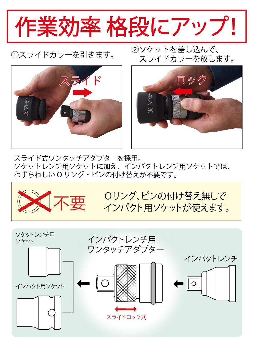 「『トップ工業 インパクト用 ワンタッチ アダプター EPA-4』は、簡単かつ迅速なワンタッチ機能を搭載しており、差込角12.7㎜のサイズは多くのインパクトレンチに適合します。スライドロック機能により、安全性が確保された状態での作業を実現します!」