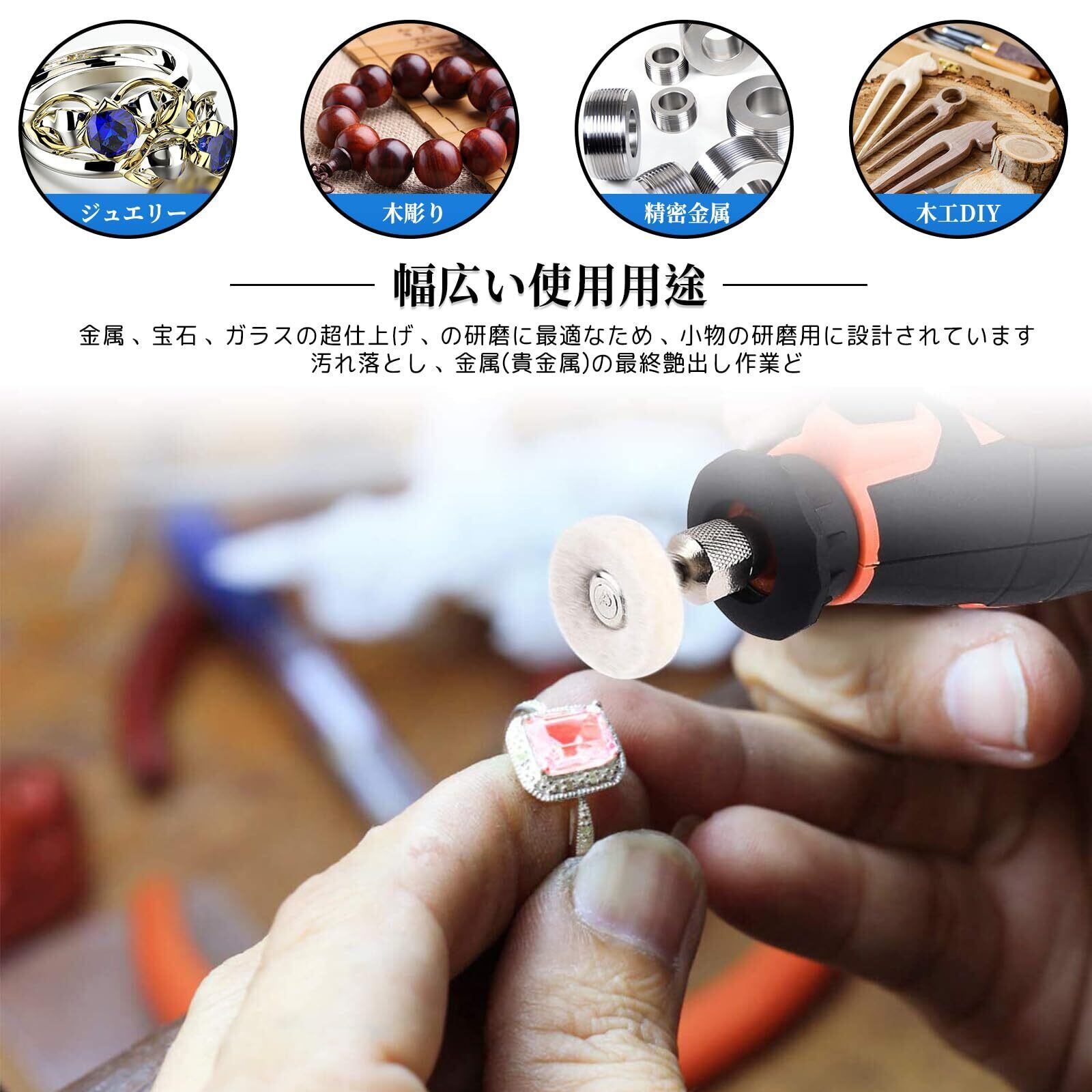 「本商品には、2種類のフェルトバフがそれぞれ15個ずつ含まれており、様々な用途に対応可能です。硬い表面から柔らかい表面まで、幅広く対応し、作業の効率を大幅に向上させます。」