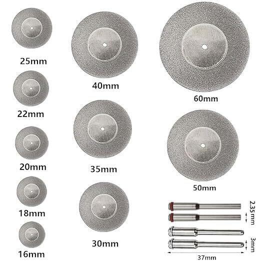 【セット内容】ダイヤモンドカッター×10枚(16mm、18mm、20mm、22mm、25mm、30mm、35mm、40mm、50mm、60mm),3mm軸2個+ 2.35mm軸2個。