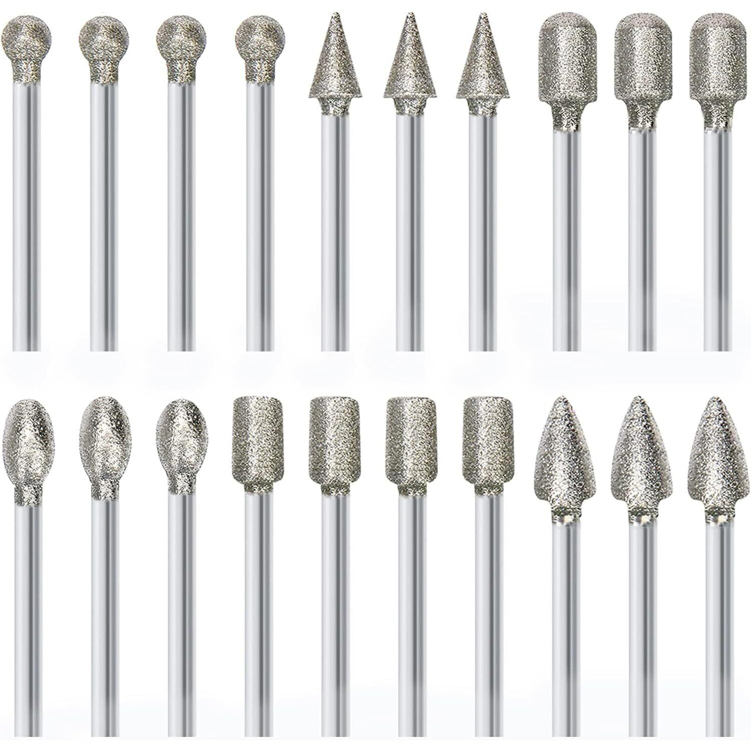 [セット内容] ダイヤモンド研削ヘッドセットは全部で20個入っており、球体、円錐、円筒形、弾丸頭、平板などのさまざまな形状、異なるデザインとさまざまな形状で設計されており、さまざまな要件を満たし、作業効率が向上し、時間を節約できます。