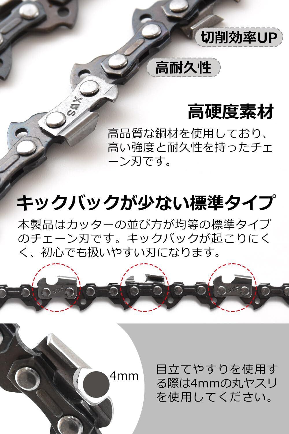 マキタ互換チェーン刃。切れ味が鋭くキックバックが少ない標準タイプで、事故抑制機構付きです。