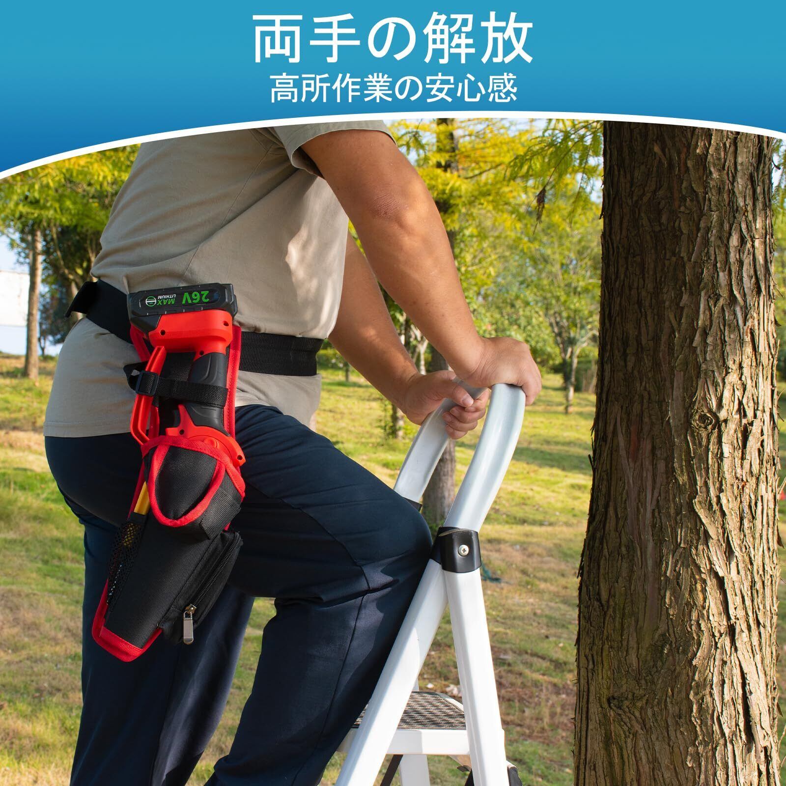 「このホルスターは、電動チェーンソーだけでなく、様々な工具にも対応できるため、高所作業や庭仕事、DIYに幅広く対応します。タスクに応じて便利に使え、作業のスムーズさをサポートします!」