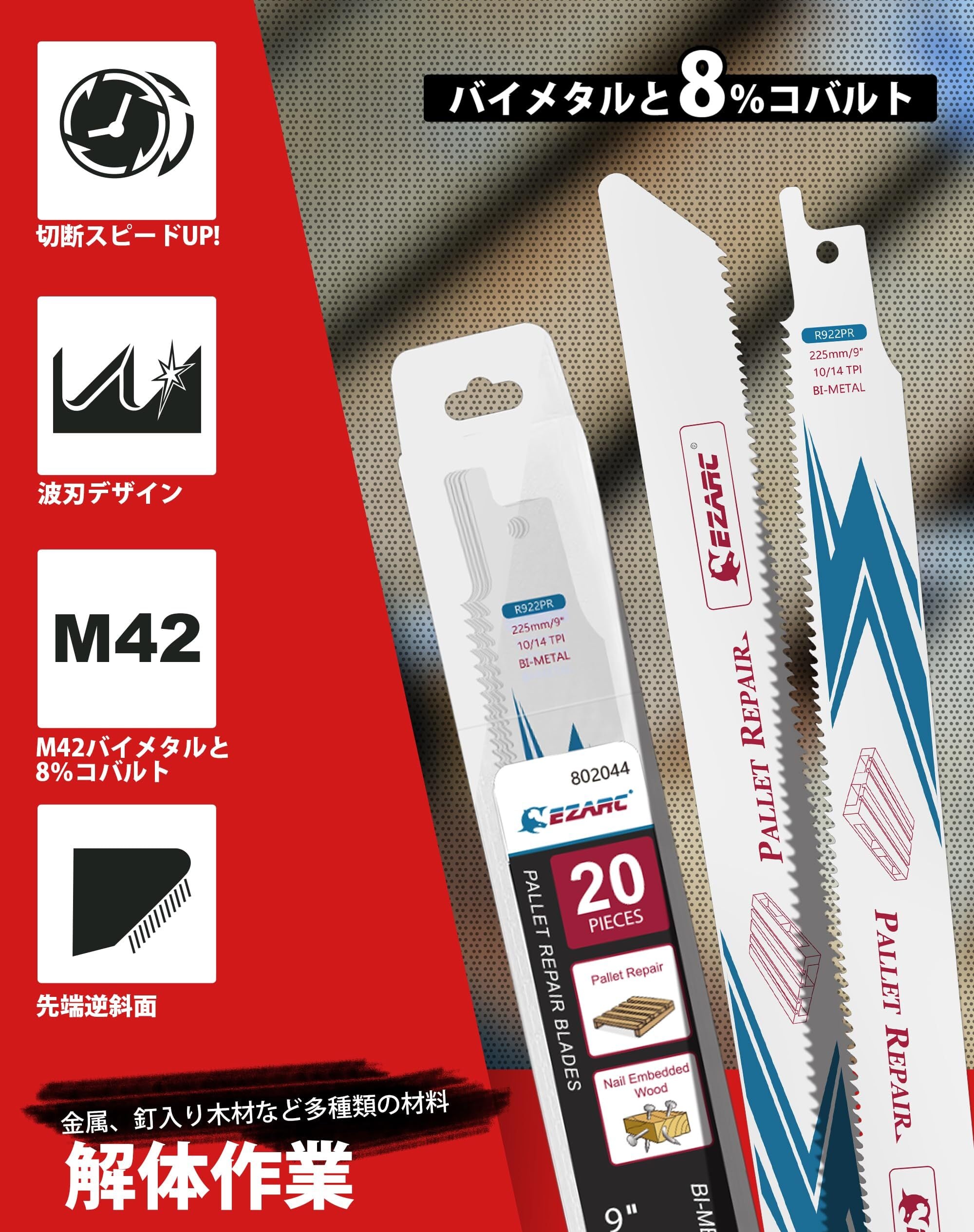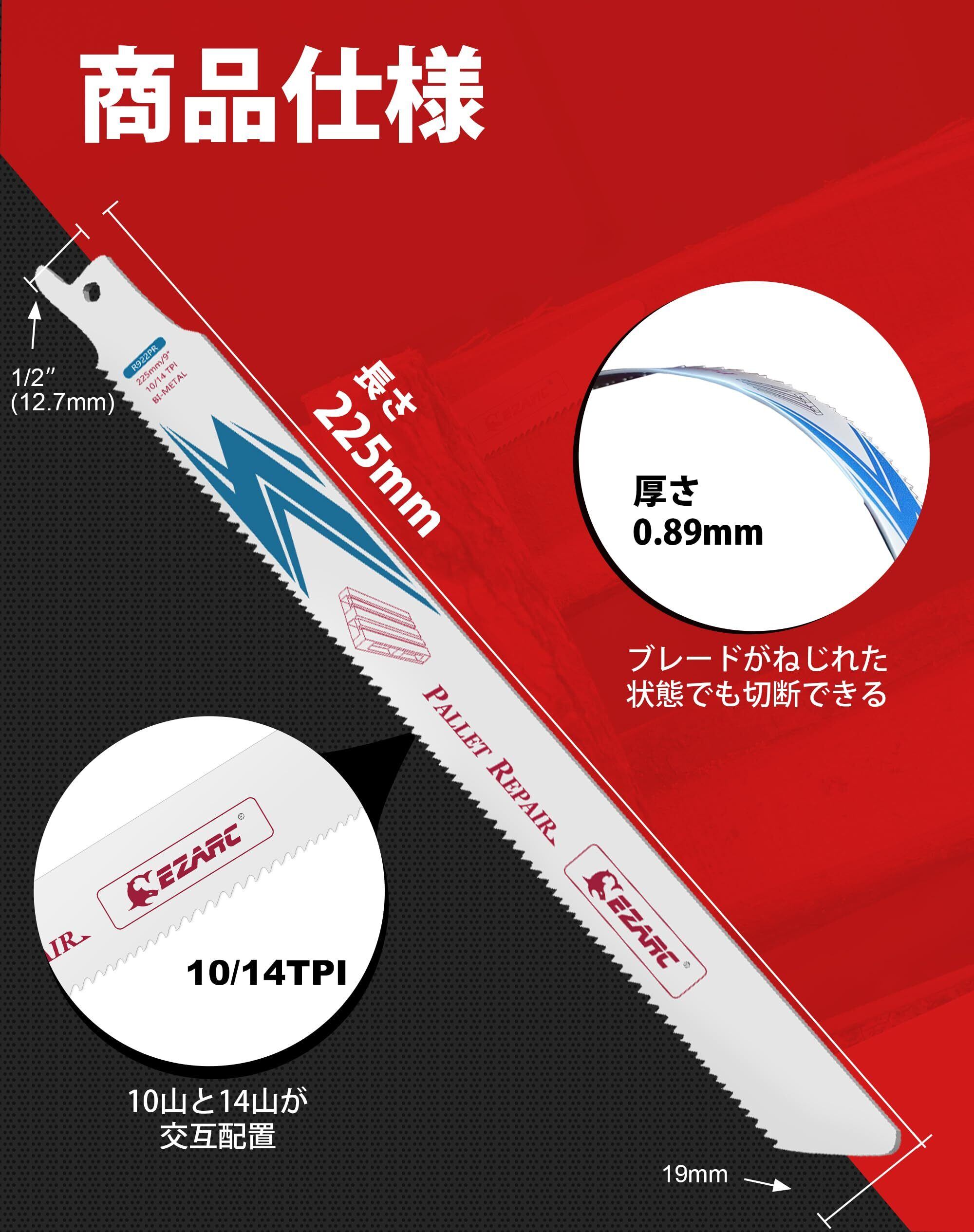 「『EZARC レシプロソー替刃 重切削』は、特に釘の入った木材やパレットの解体作業に最適化された高品質なブレードです。10/14山の設計により、さまざまな素材をスムーズかつ迅速に切断できるので、プロの現場でも活躍間違いなし!」