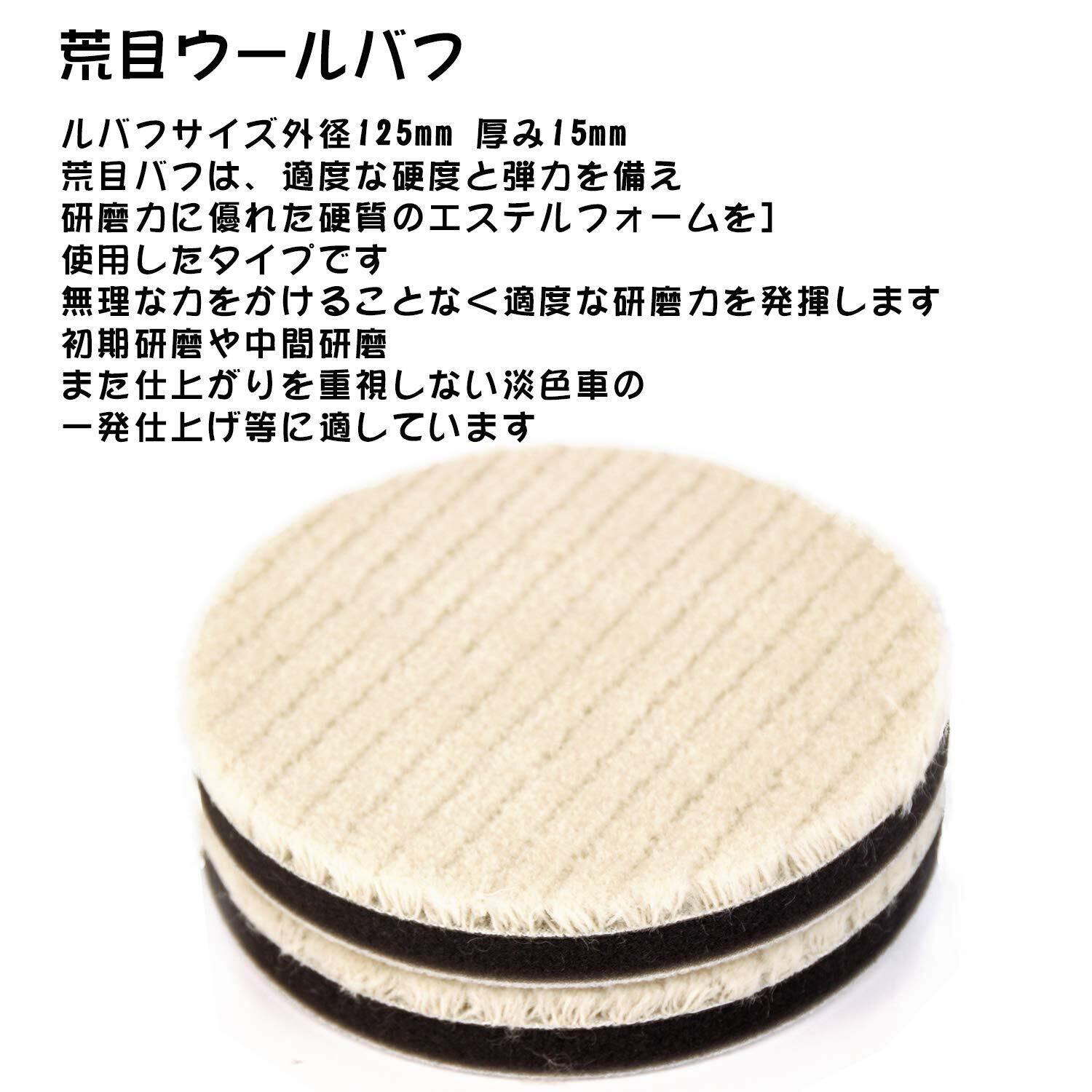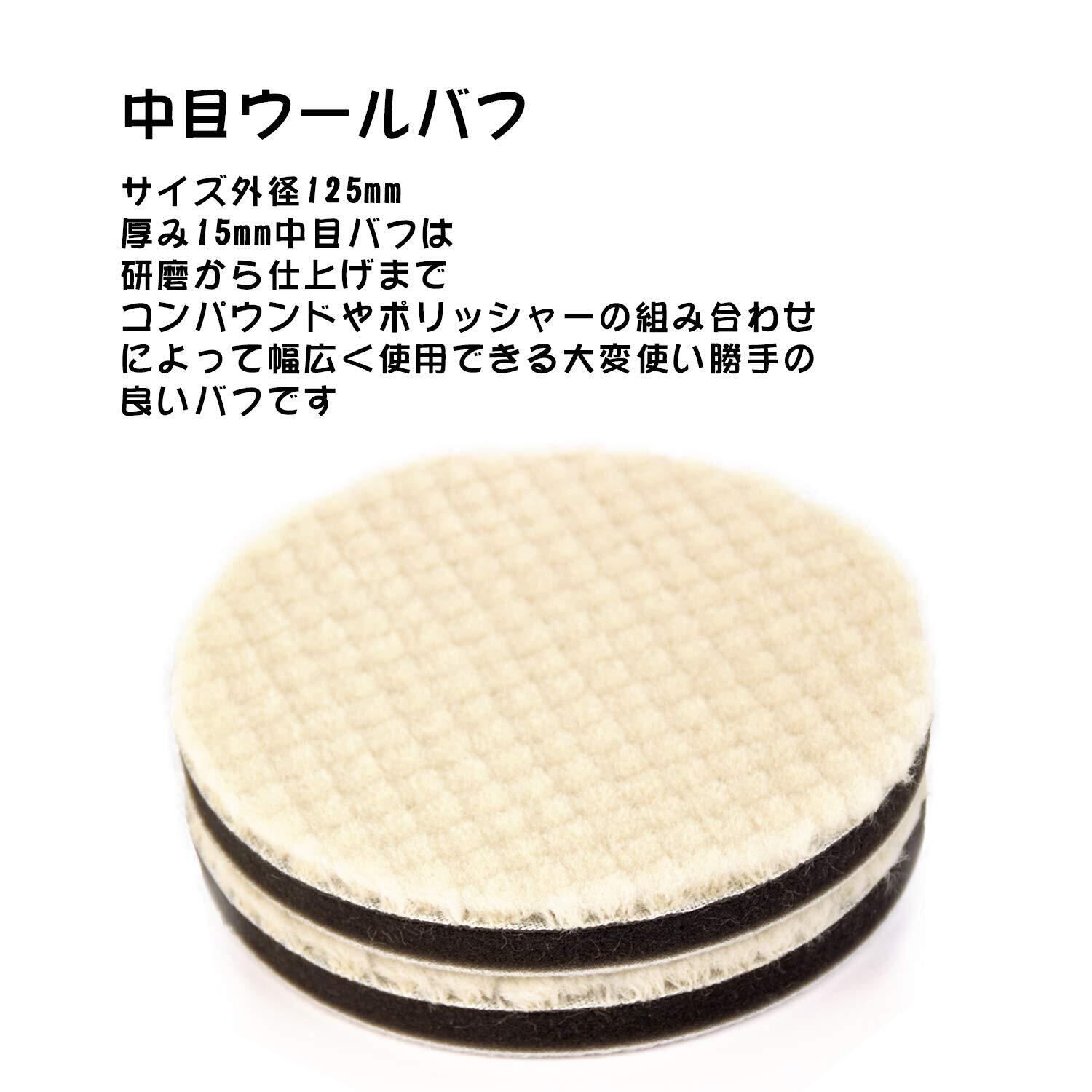 「『車磨き用 バフ ポリッシング』は、荒目、中目、細目の3種類のバフが揃った6個セットです。125mmのサイズで、車のボディやヘッドライトなど、様々な面を効率的に磨くことができます!」
