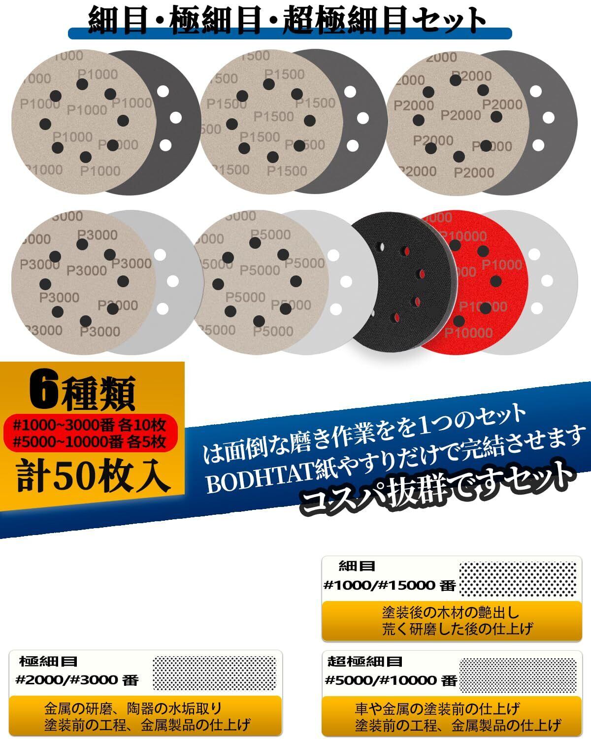 耐水ペーパー 125mm ディスクペーパー #1000~10000番 ランダムサンダー ペーパー マジック式 サンディングディスク 丸型 8穴 耐水サンドペーパー 6種類50枚入セット 1000 1500 2000 3000 5000 10000 付アダプターパッド1枚,ヘッドライトの研磨 木工DIY作業に 金属磨き