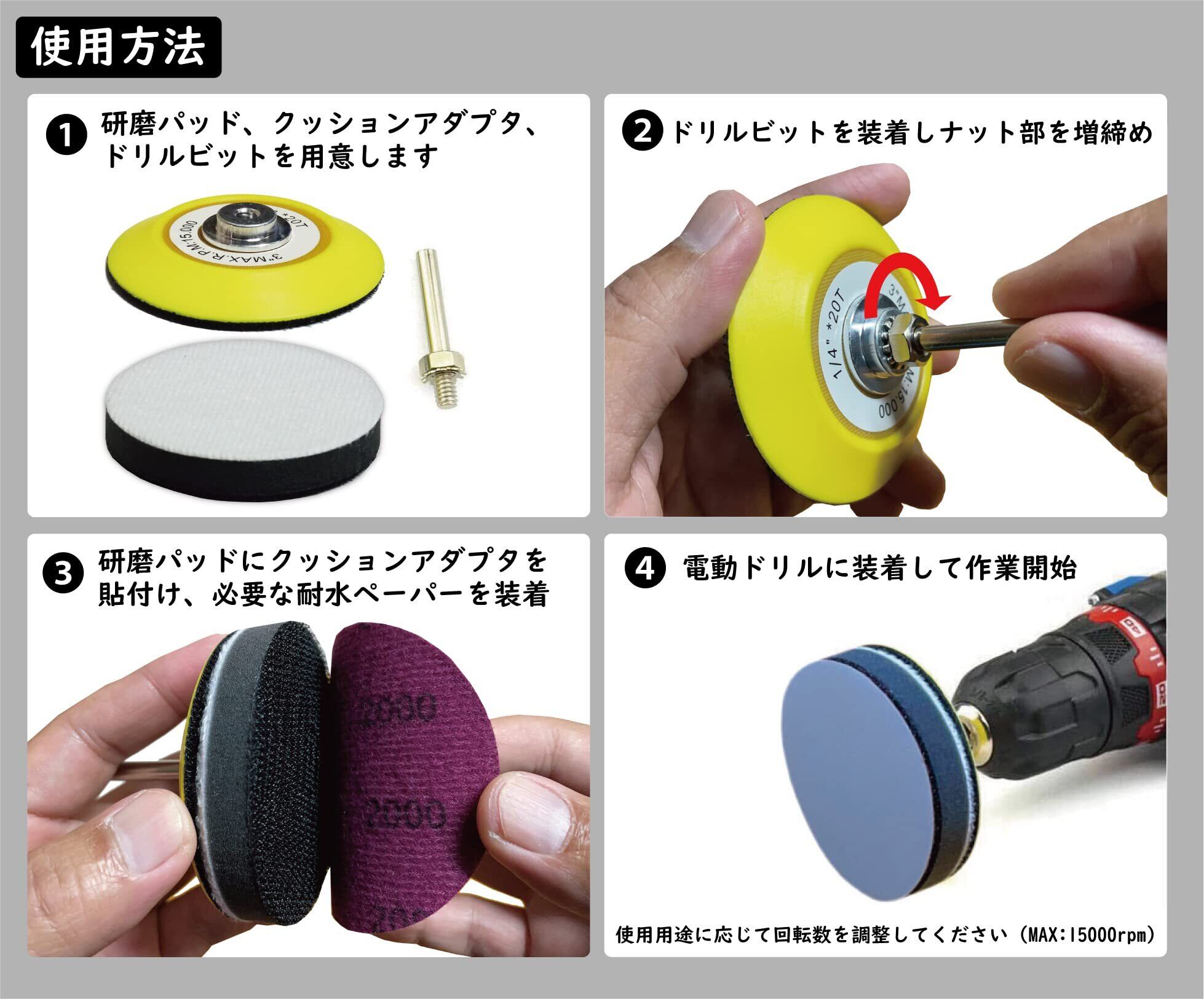 「このクッションパッドは耐衝撃性が高く、どんな研磨作業でも安心してご利用いただけます。木材や金属板など、様々な素材の研磨時に優れたパフォーマンスを発揮します!」