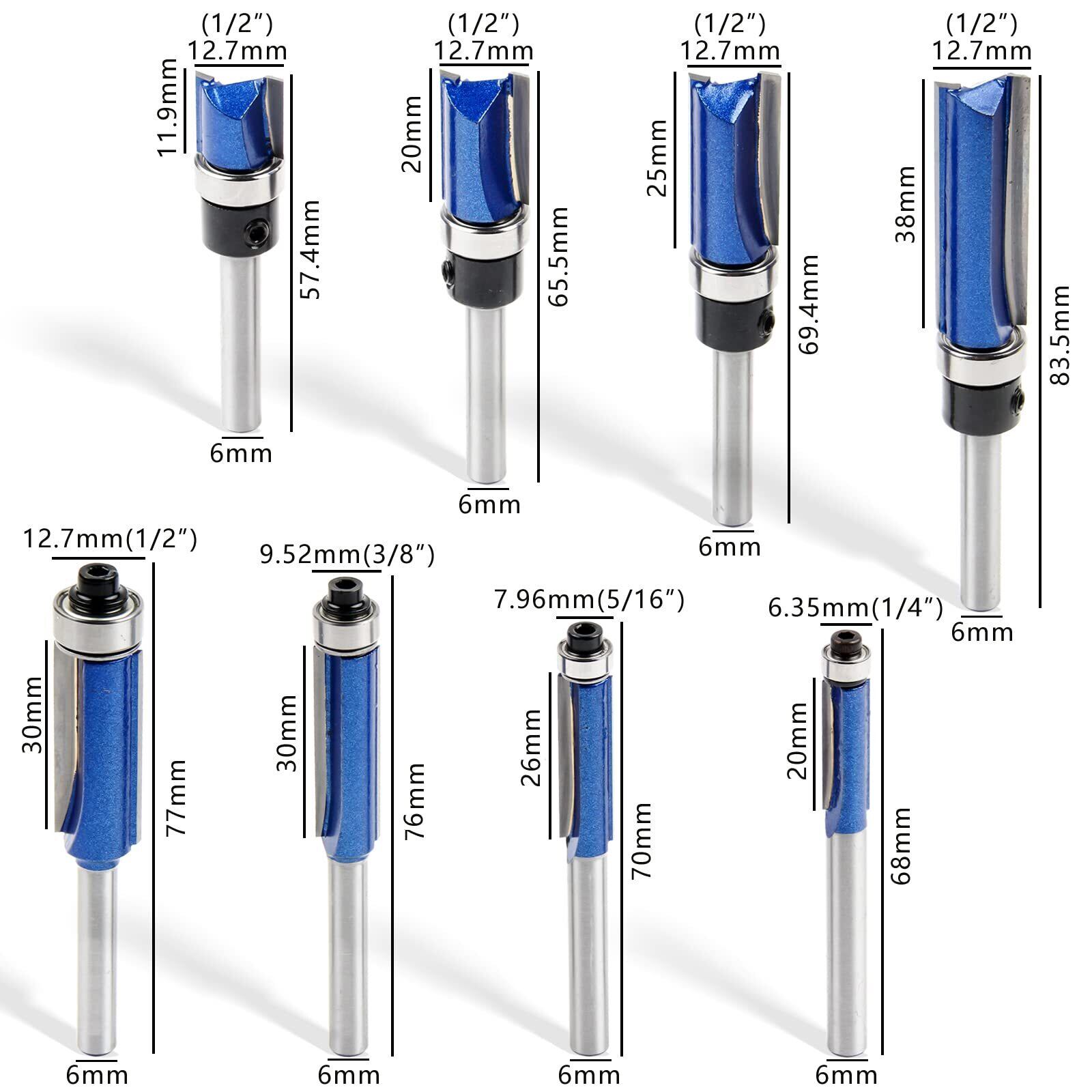 トリマービット ルータービット 轴径6mm 8本入り 面取りビット ベアリング付き トリマー ビット ストレート ほぞカッター 溝ほり 溝切り 飾り面加工 電動トリマー 木工用