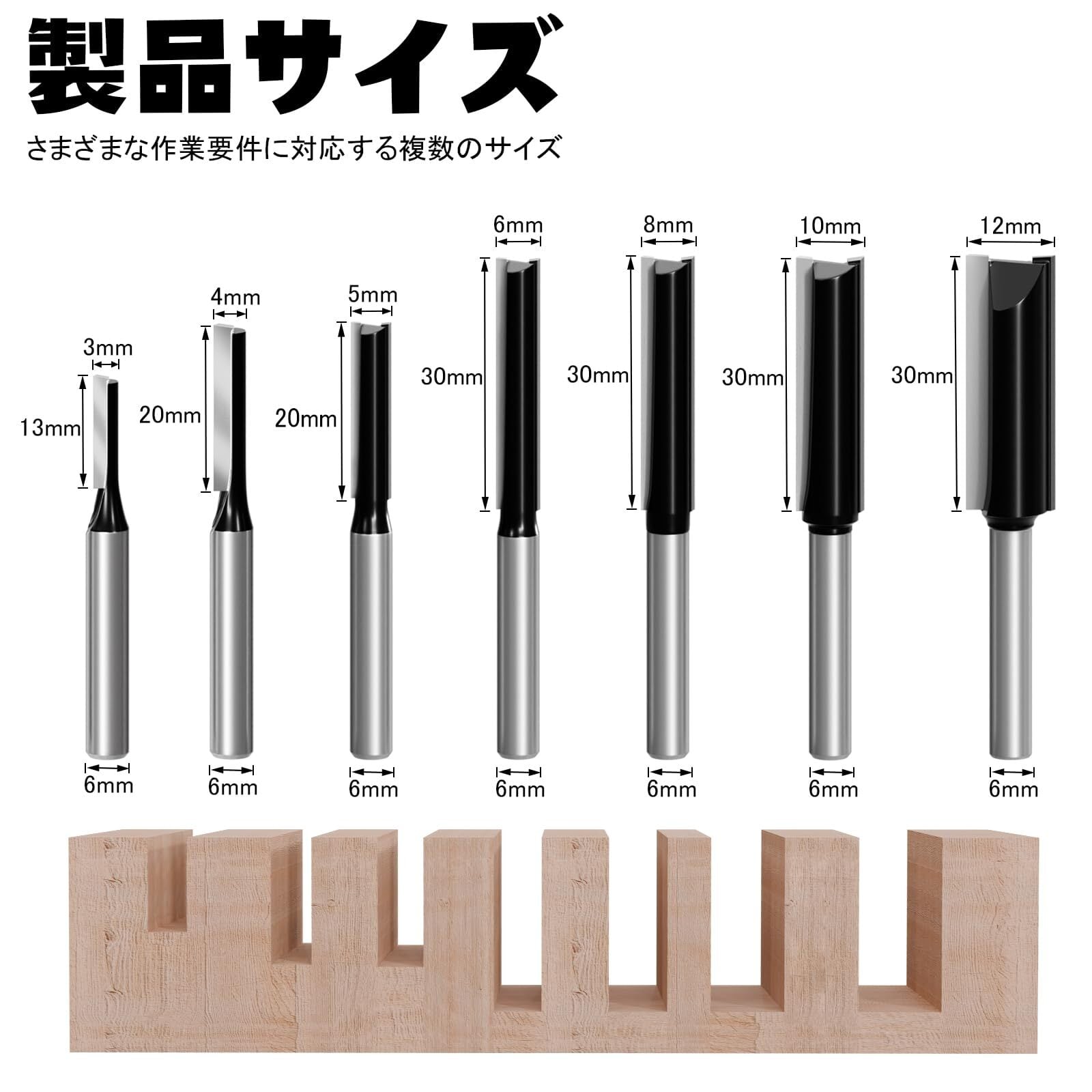 【用途】7本の多様なビットで幅広い加工が可能ストレートカット、溝掘り、面取りなど、様々な木工作業に対応する豊富なビットセット。