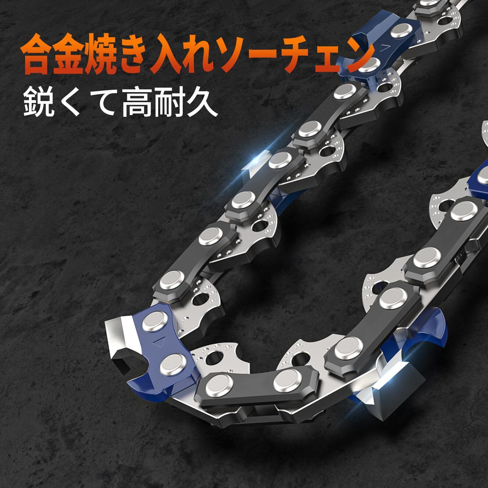 「『12インチ充電式チェーンソー替刃』は、耐摩耗性に優れた高品質な材質を使用しており、長時間の使用でも安定した性能を維持します。安心してご利用いただける耐久性を誇ります。」