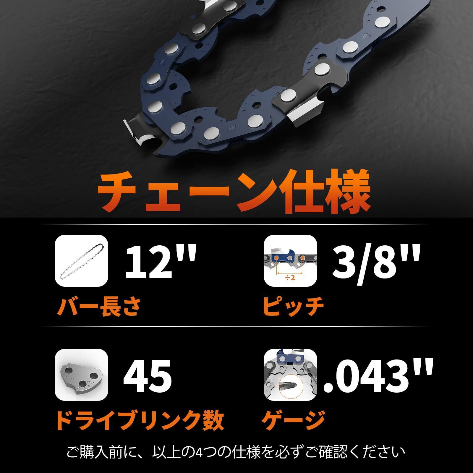 「『12インチ充電式チェーンソー替刃2本セット』は、300mmのガイドバーに対応した高品質なチェーンソー替刃です。3/8"ピッチと.043"ゲージにより、快適な切断を実現し、プロの作業現場から家庭での使用まで幅広く対応します!」