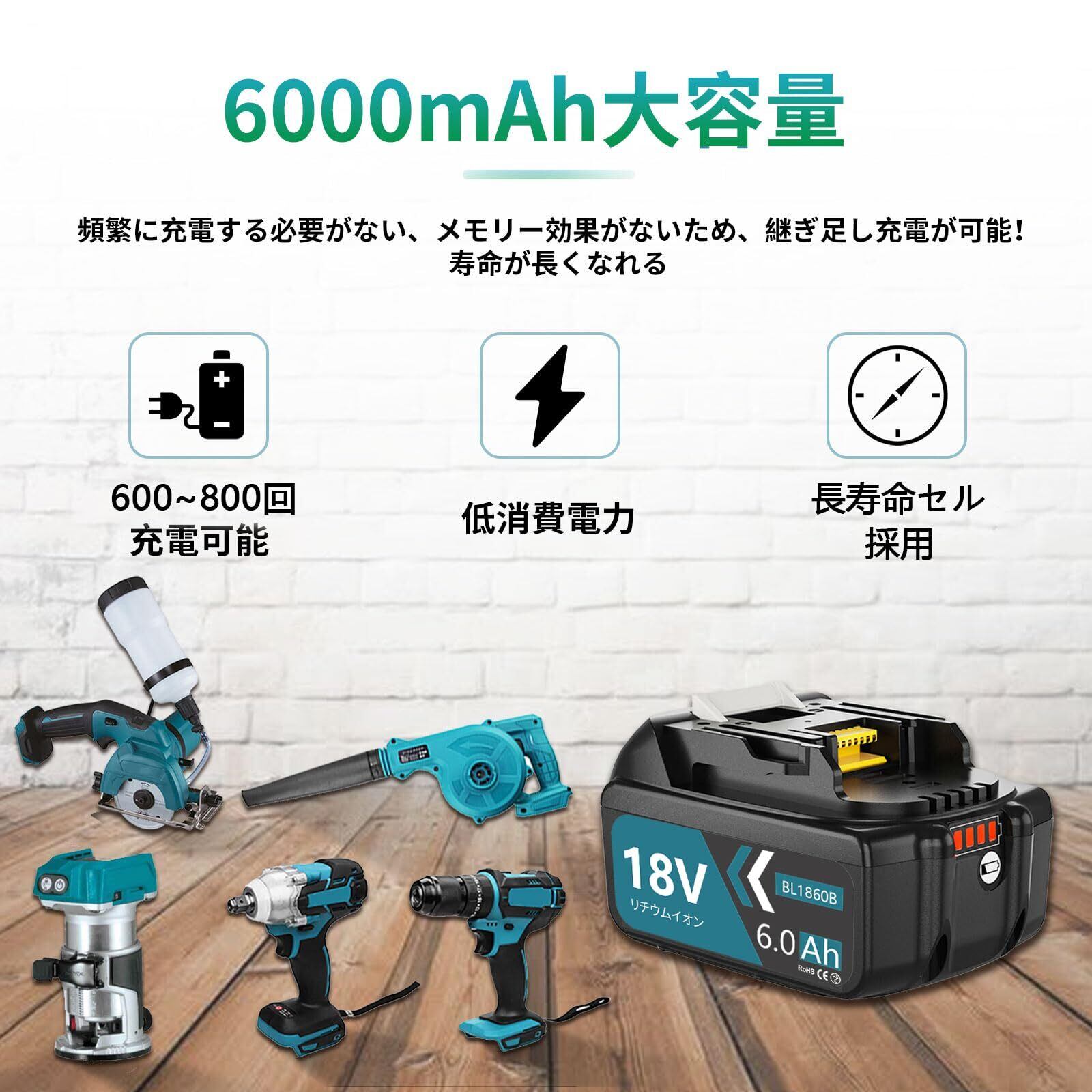 「『VANKO 互換 マキタ 18V バッテリー BL1860B』は、6.0Ahという大容量を誇ります。これにより、様々なマキタ製電動工具で長時間の作業が可能です。パワフルで高効率な電源として、作業の効率化を実現します!」