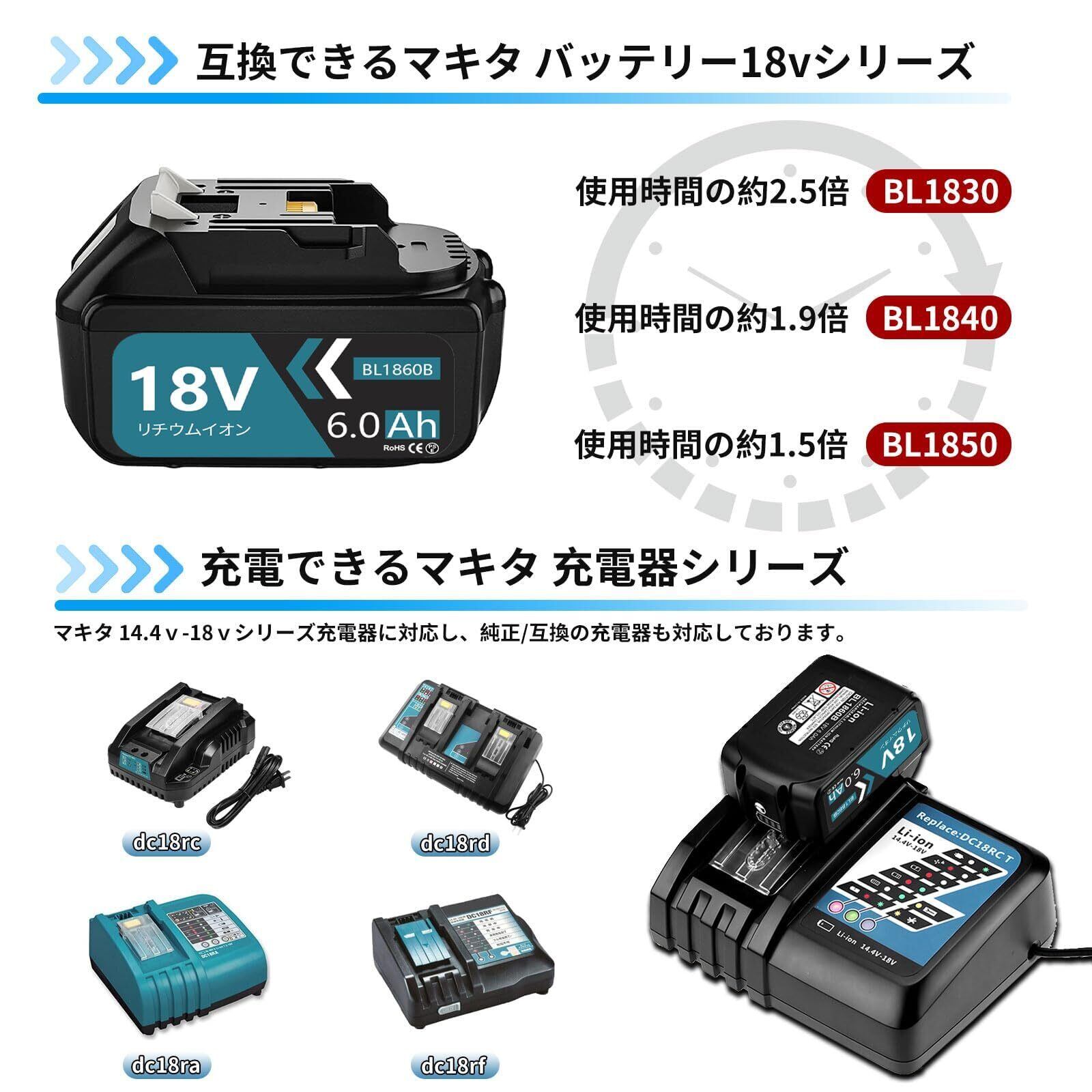 「『BL1860B』は、マキタの多様な18Vシリーズに幅広く対応しています。BL1815NやBL1820Bなどのバッテリーにも互換性があり、多様な電動工具で活用可能です!」