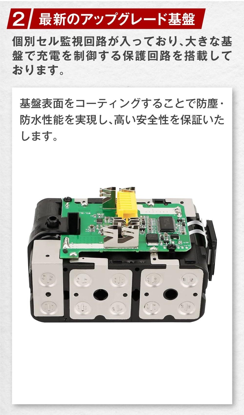【アップグレード基盤を採用】個別セル監視回路が入っており、大きな基盤で充電を制御する保護回路を搭載しております。基板表面をコーティングすることで防塵・防水性能を実現し、高い安全性をいたします。
