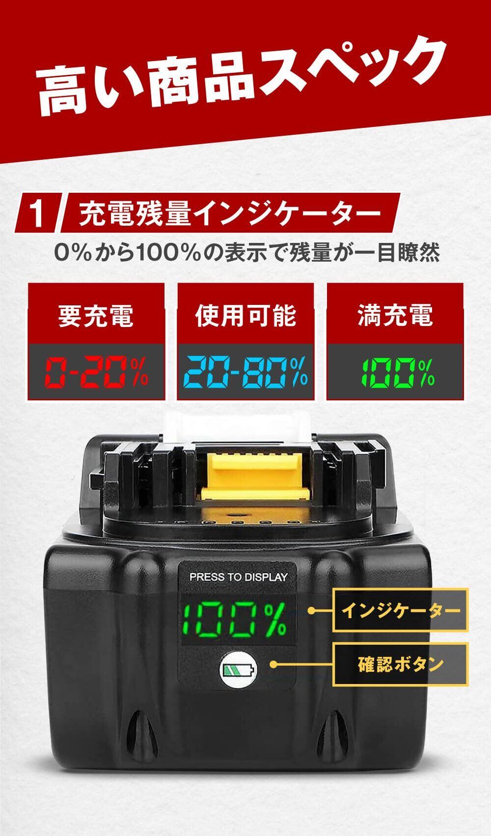 「《互換ラボ マキタ バッテリー 18V》には、残量を一目で確認できるLEDデジタル表示が付いており、作業中の予期しない切れを未然に防ぎます。この機能により、計画的にバッテリーを管理でき、作業を続行する際の安心感を提供します!」