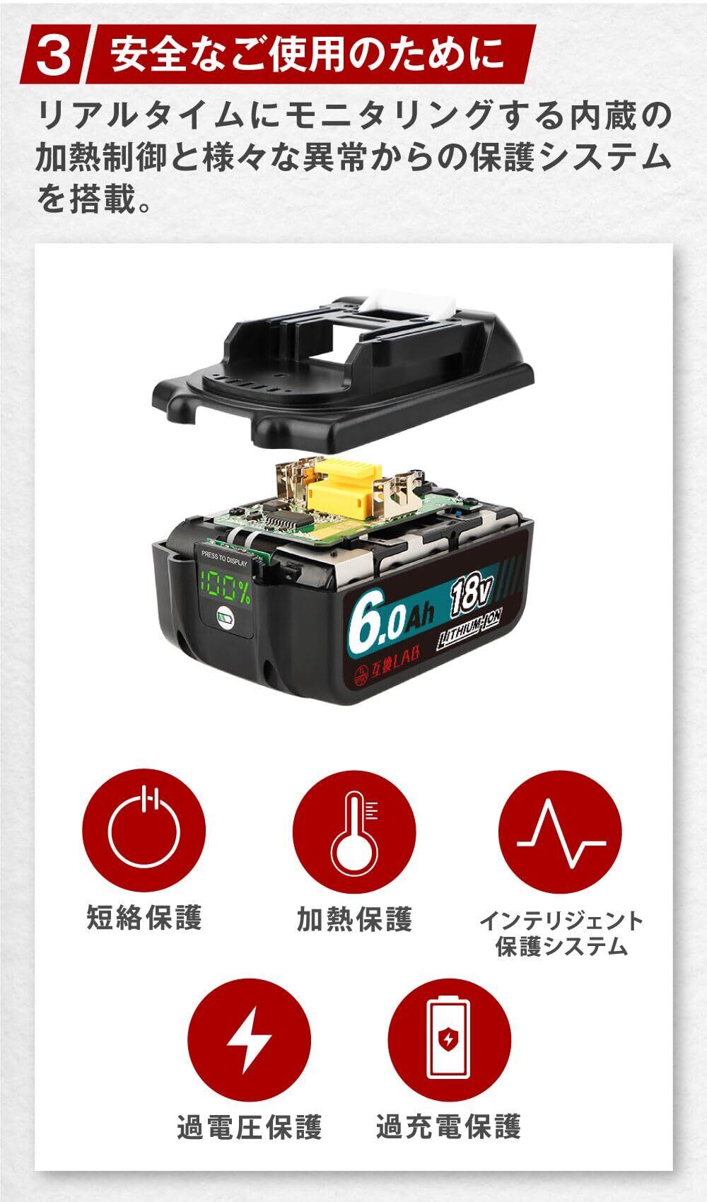 【保護システム搭載】リアルタイムにモニタリングする内蔵の過熱制御と様々な異常からの保護システムを搭載。短絡保護、加熱保護、インテリジェント保護システム、過電圧保護、過充電保護に対応。