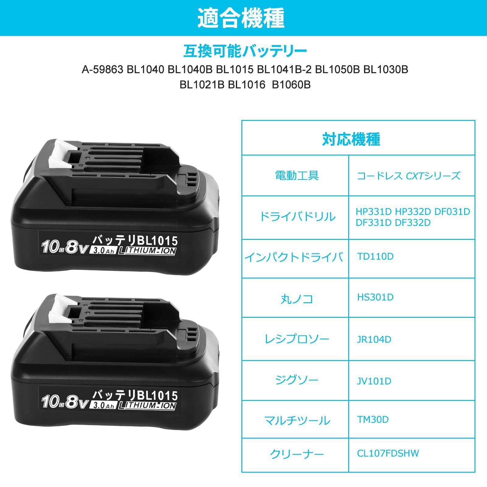 【互換可能バッテリー】互換可能バッテリー:A-59863 BL1040 BL1040B BL1015 BL1030B BL1050B BL1041B-2 BL1021B BL1016 BL1060B など(純正バッテリーに準ずます)。