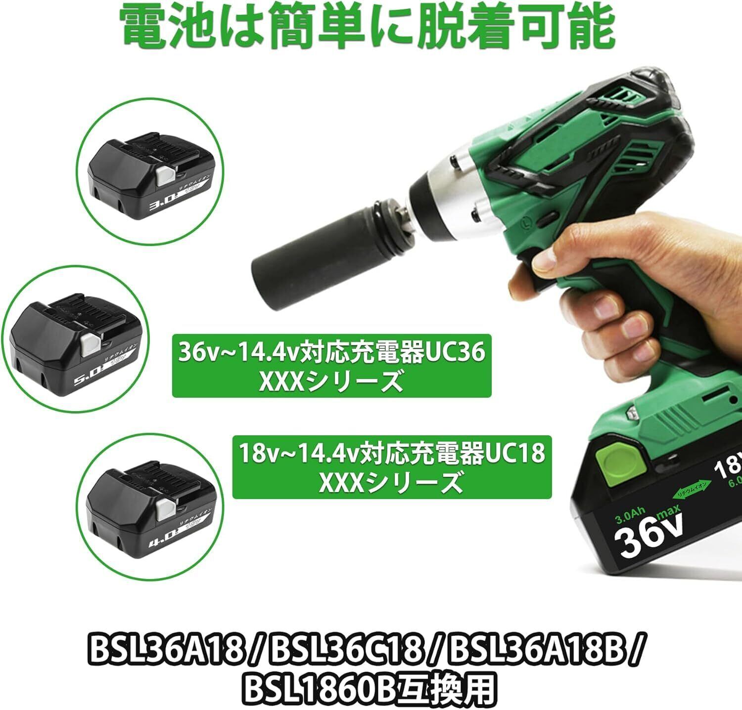 「本バッテリーは、日立のインパクトドライバーや電動工具との高い互換性を誇り、BSL36A18、BSL36B18、BSL36C18など様々なモデルに対応しています。互換性を重視した設計だから、安心してご使用いただけます。さらに、充電器に接続するだけで簡単に充電ができ、手間いらずです!」