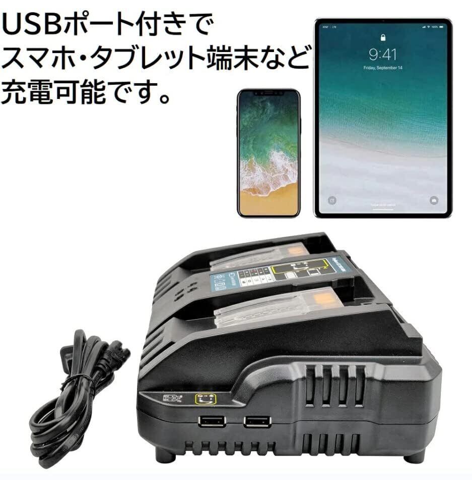 「この充電器は2口同時に充電可能。複数のバッテリーを一度に充電できるため、時間を節約し、作業効率を大幅にアップさせることができます。」