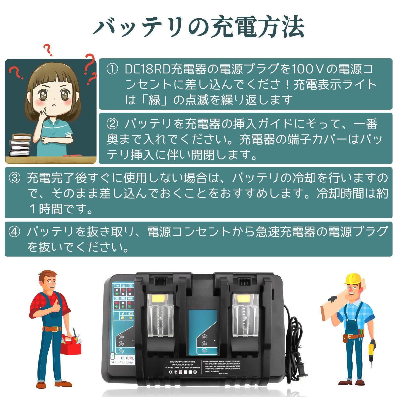 【信頼の品質】新しいの検査機器で十分に検査された高品質なマキタ 18v 充電器です。純正品と遜色なく使えます。工場で検査済みの商品をお届けしています。本体とバッテリの接触はマルチコンタクト端子により接触が安定します。また振動にも強い設計です。寿命特性、充電時間、連続使用時間も純正品と同レベルの商品です。の製品は1年のを提供して、6億製造物責任保険が契約した、お届けした商品に何か問題がございましたら、お気軽にご連絡ください。 12時間以内に対応し、問題を迅速に解決することをお約束します。