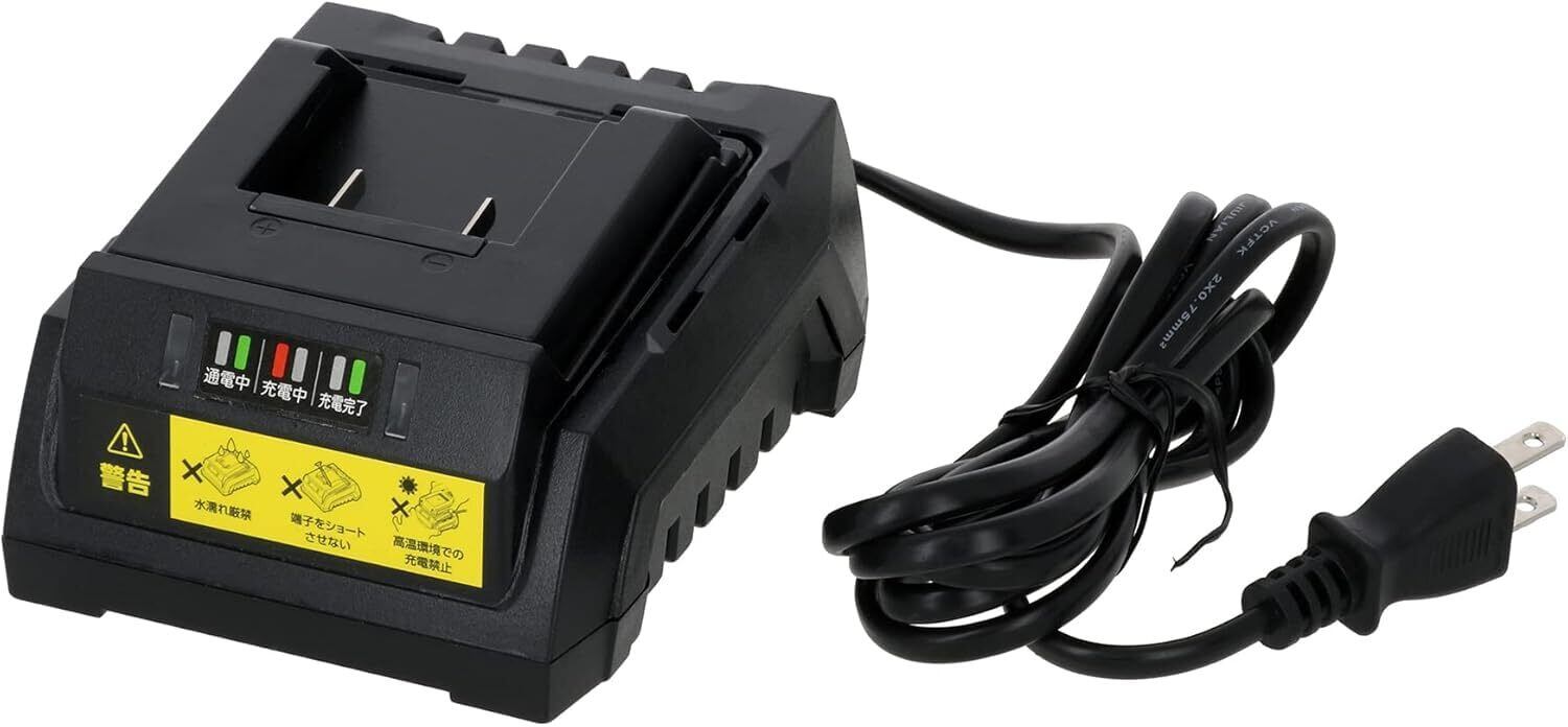 【仕様】定格電圧:AC100V、定格周波数:50/60Hz、出力電:DC20V、充電時間:2.0Ah約60分/4.0Ah約120分/5.0Ah約140分、コード長:約1.8m、本体サイズ:約長さ150×幅108×高さ70(mm)、質量:約0.39kg、充電温度範囲:10~35℃