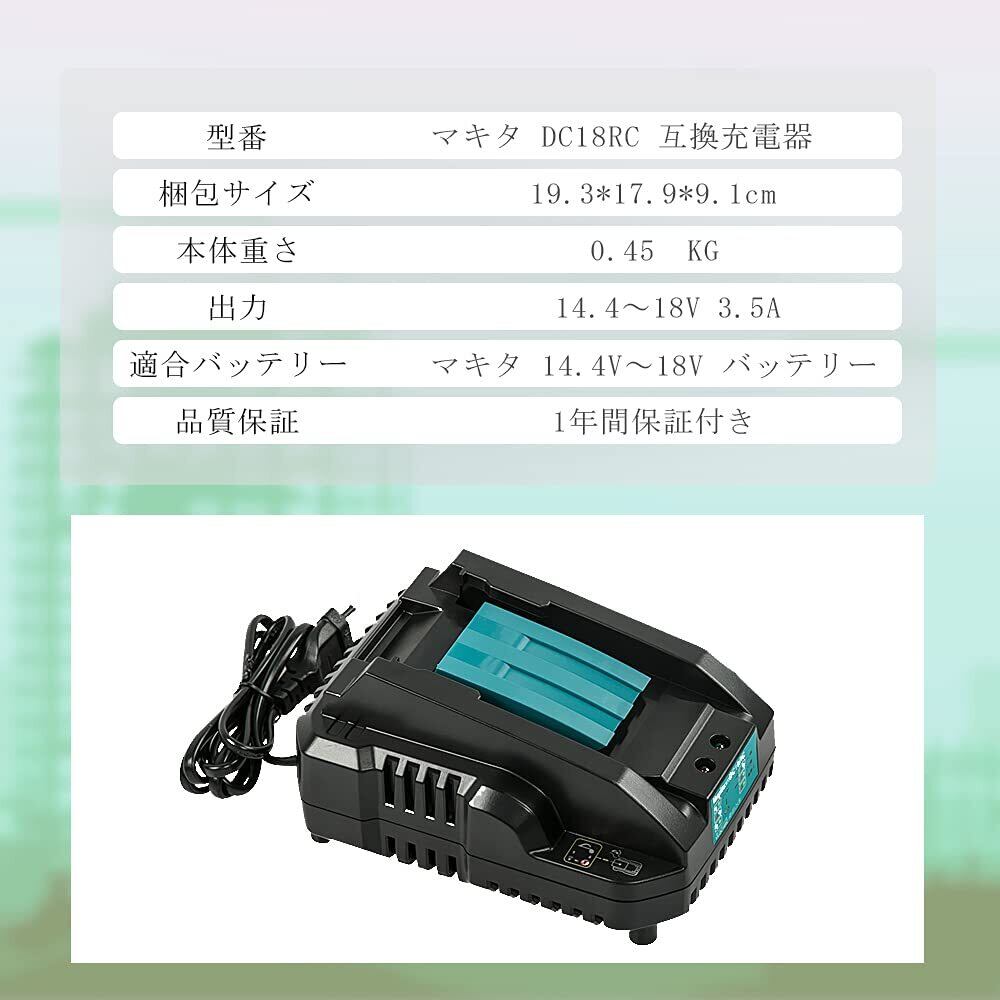 【商品仕様】:◆マキタ DC18RC 充電器 互換品 3.5A ◆本機寸法:長さ:16cm×幅12.5cm×高さ8.5cm ◆質量:0.45kg ◆入電圧:100V ◆入力周波数:50ー60Hz ◆出力電圧:直流7.2-18v ◆出力電流:直流3.5A
