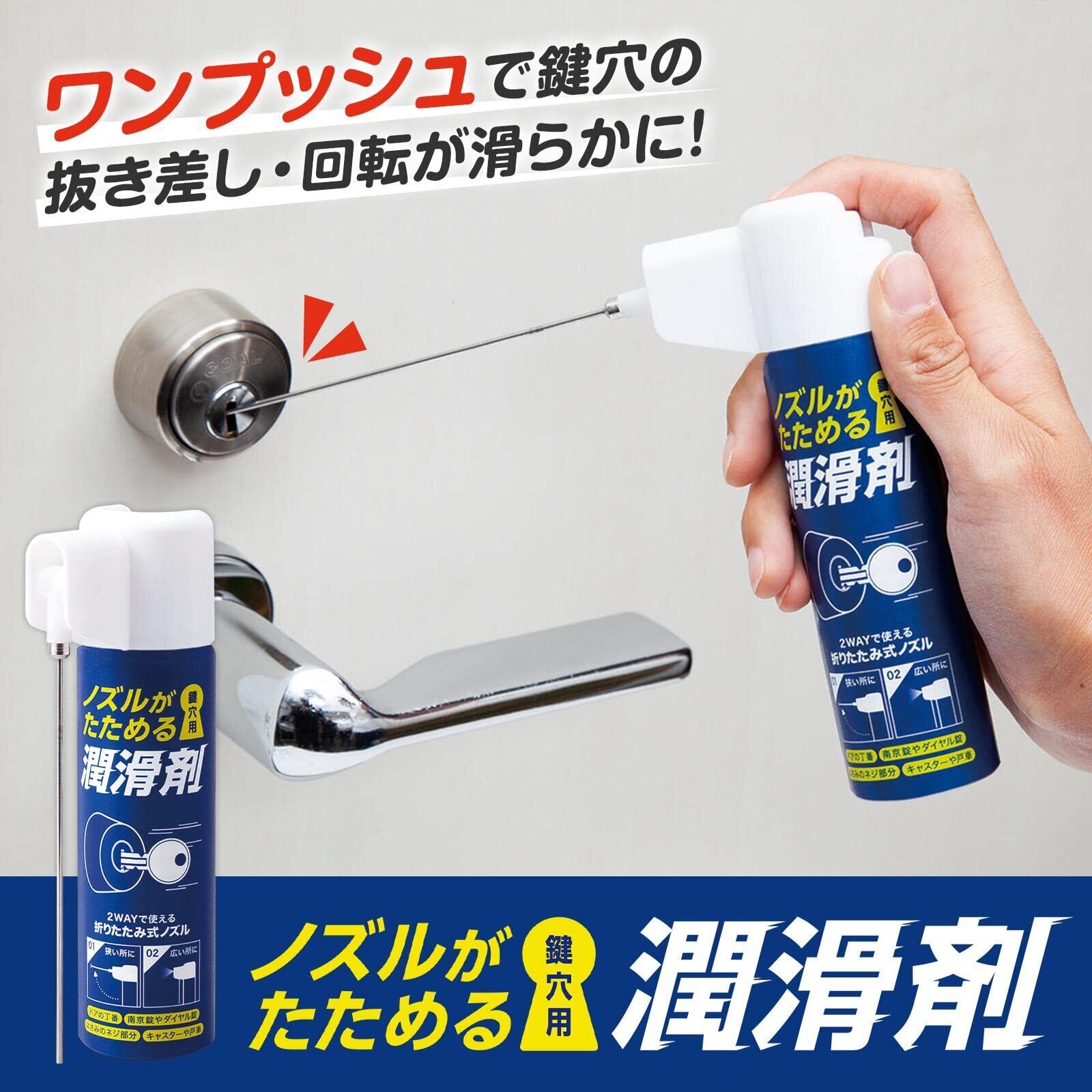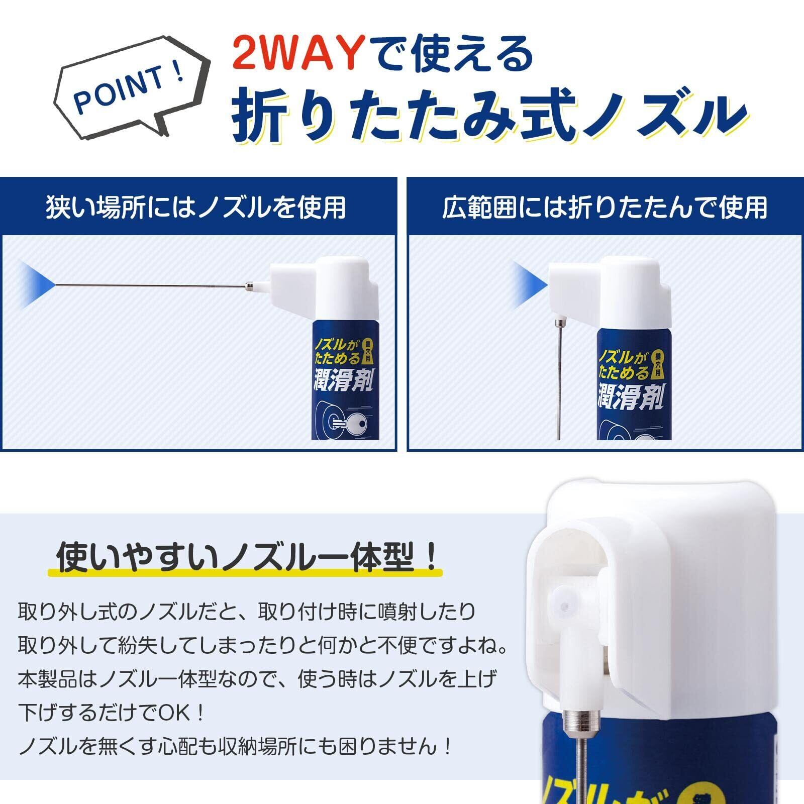 「この潤滑剤は、ノズル部分が折りたためる2WAYデザインを採用。必要に応じてピンポイントでのスプレーや広範囲での噴霧が可能なので、作業シーンに応じた使い方ができます。鍵穴や丁番だけでなく、様々な小さな隙間に潤滑効果を発揮します。」