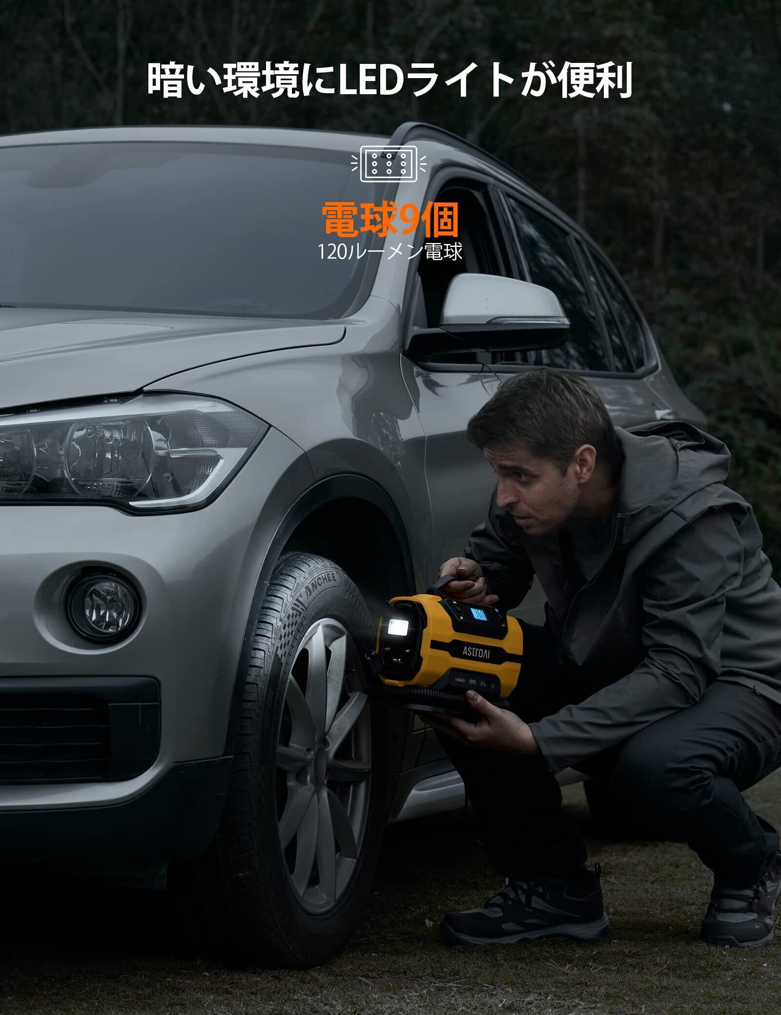 「『AstroAI エアーコンプレッサー』は、タイヤやプール、バイク、自転車などさまざまな用途に対応した便利な電動空気入れです!最大150 PSIまでの圧力で、高速かつスムーズな空気充填を実現します。」