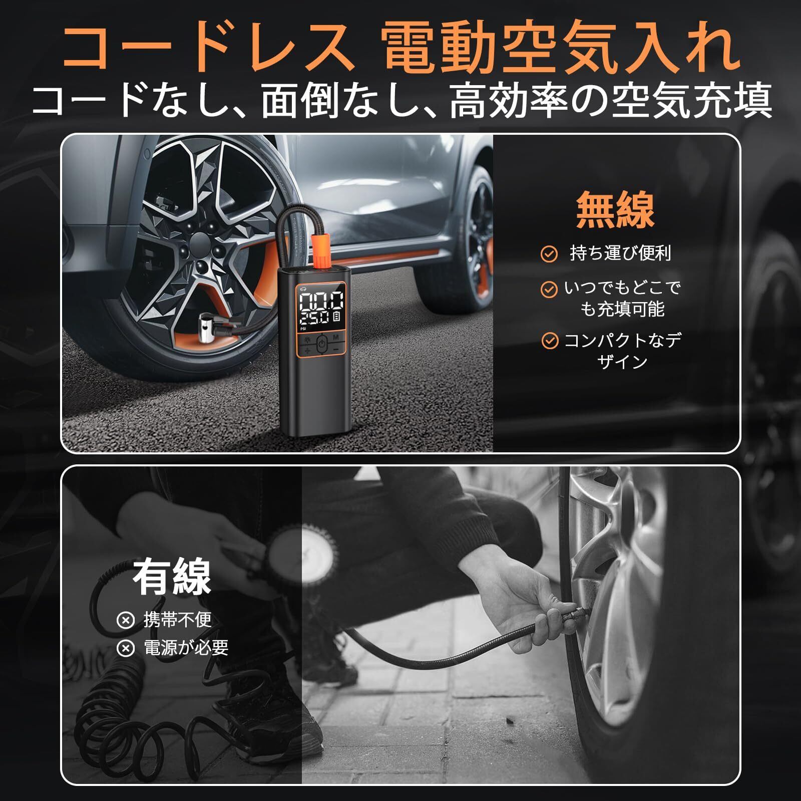 「『電動空気入れ 車 自転車 バイク用 USB充電式 エアーコンプレッサー』は、最大圧力150PSIを誇る強力なエアコンプレッサーです。バイク、自転車、ボール、浮き輪など、さまざまなアイテムに対応可能で、アウトドアイベントや旅行にも最適なアイテムです!」