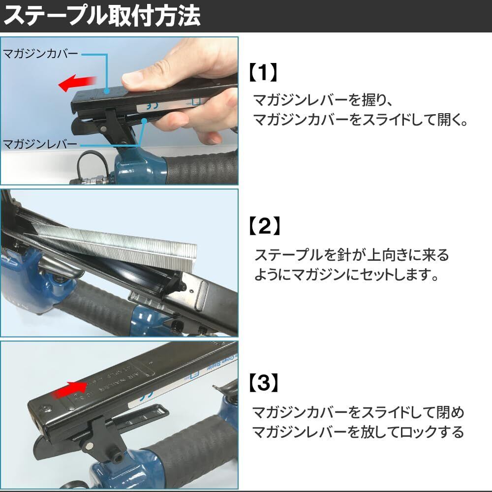 【多用途のエアータッカー】J線ステープル専用。家具木工、バイクシートやイス張替え、内装・外装作業に活躍。エアー釘打ち機(ネイルガン)やフィニッシュネイラーと並ぶDIY必須工具。