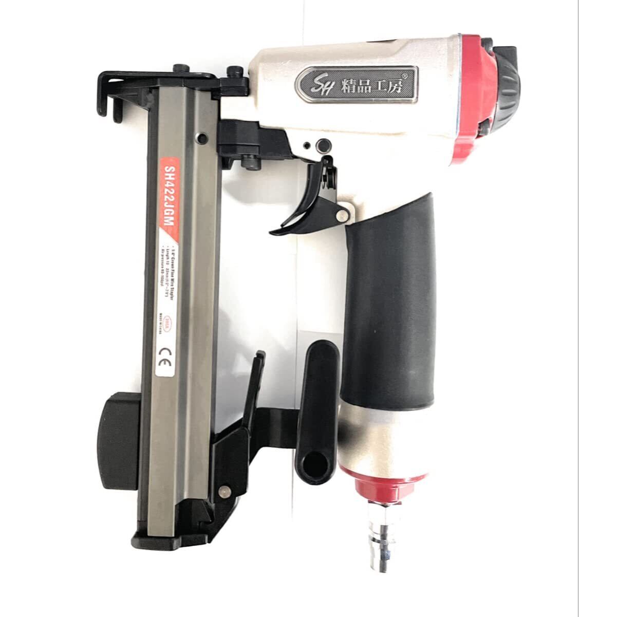 「『SHHG422JGM 岩綿 エアタッカー』は、常圧に対応したエアタッカーです。特に4mmのJ線に対応しており、岩綿や吸音板の取り付けに最適です。プロの現場からDIYまで様々な用途に対応でき、高性能を発揮します!」