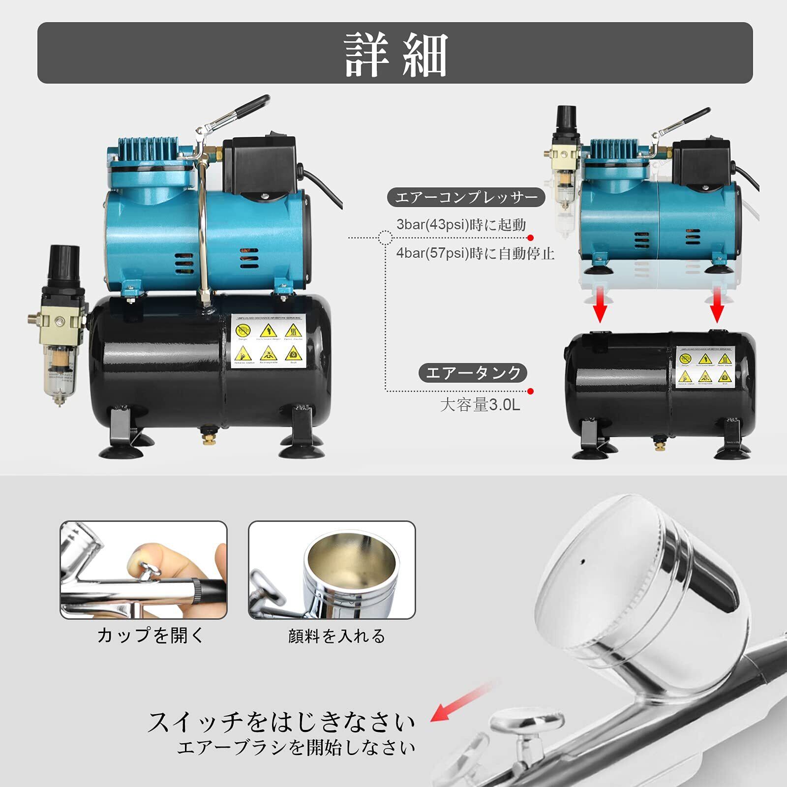 「このエアブラシコンプレッサーは、塗装だけでなく、模型制作やアート、デコレーションなど多彩な用途に対応。様々なエアブラシアクセサリーがセットになっているため、初心者でもすぐに始めることができます。簡単に使える説明書も同封していますので、安心してご使用ください。」