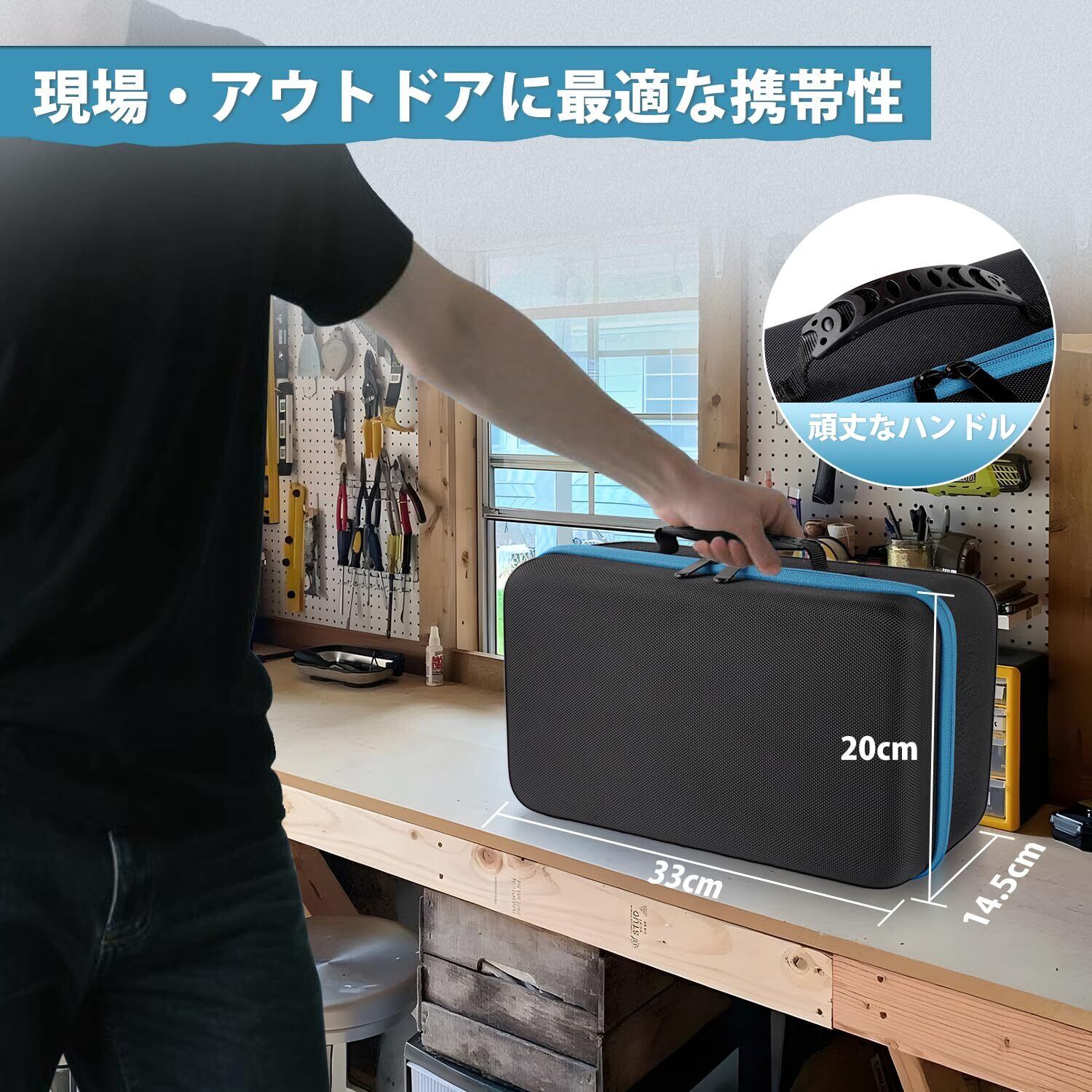 「本製品は、耐衝撃性が高く、耐久性に優れた素材で作られており、過酷な環境でも安心して使用できます。また、表面が防水性のため、雨天時や湿気の多い休日でも、中の機器をしっかりと守ります。さらに使用後は、延長ベルクロにより簡単に収納可能です。」