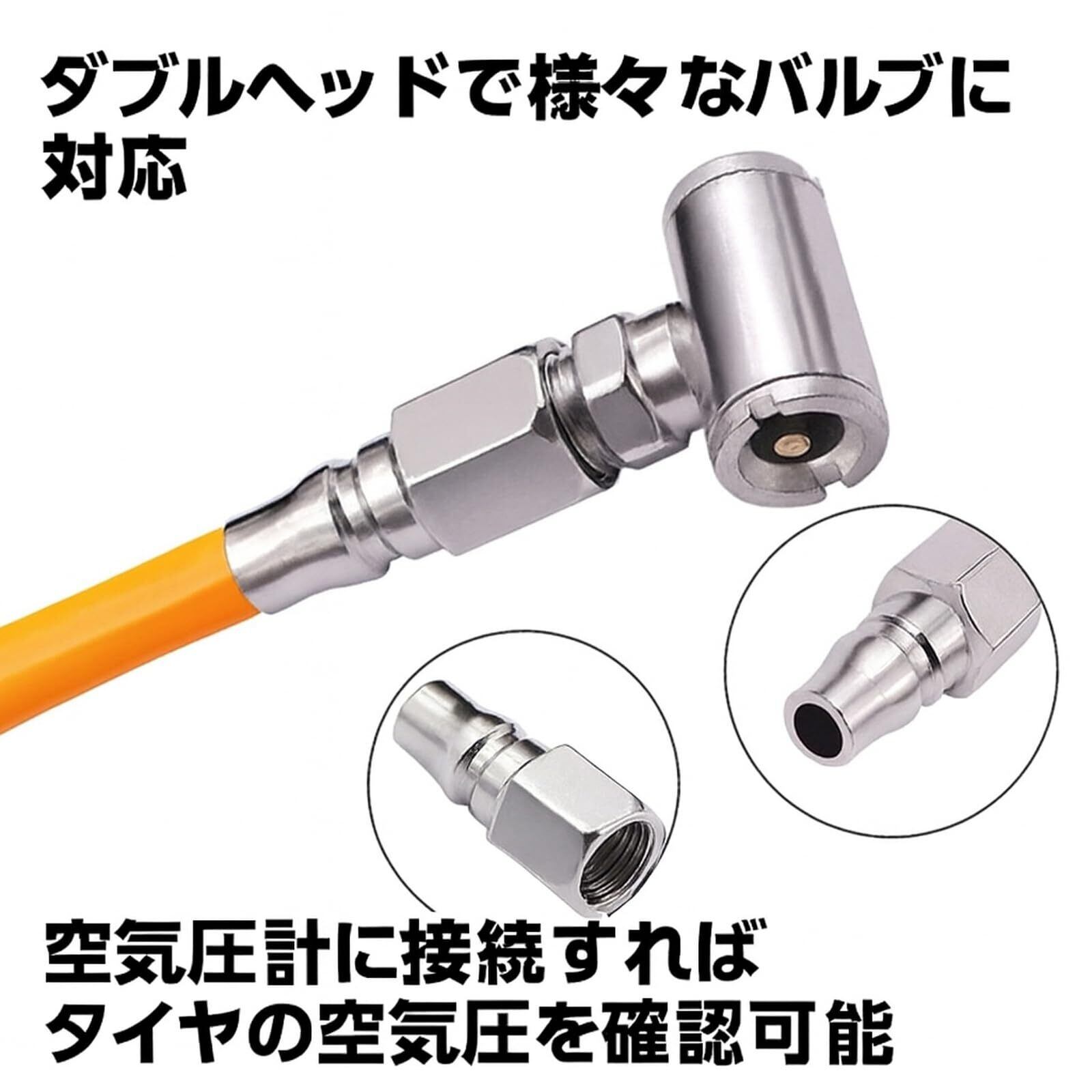 【便利なダブルヘッド設計】ダブルヘッド構造により多様なバルブに対応 空気圧計に接続すればリアルタイムでタイヤの空気圧を確認でき、安全性がさらに高まります