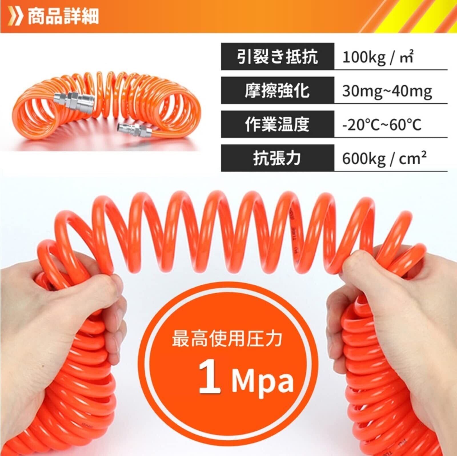 エアーコンプレッサー用スパイラルエアーホースです。 内径8mmで高流量に対応、有効長2mの作業範囲に対応いたします。折れ曲がりに強いPU製エアーホースです。 ワンタッチカプラー装着されておりますので、到着後にすぐにご使用いただけます。 ※安価にご提供させていただくため簡易パッケージでの販売です。 ※1.0Mpaを超えて使用しないでください。エアー漏れのある場合は作業を中断して下さい。 ※ホースにキズ、破れのある場合は作業を中断して下さい。