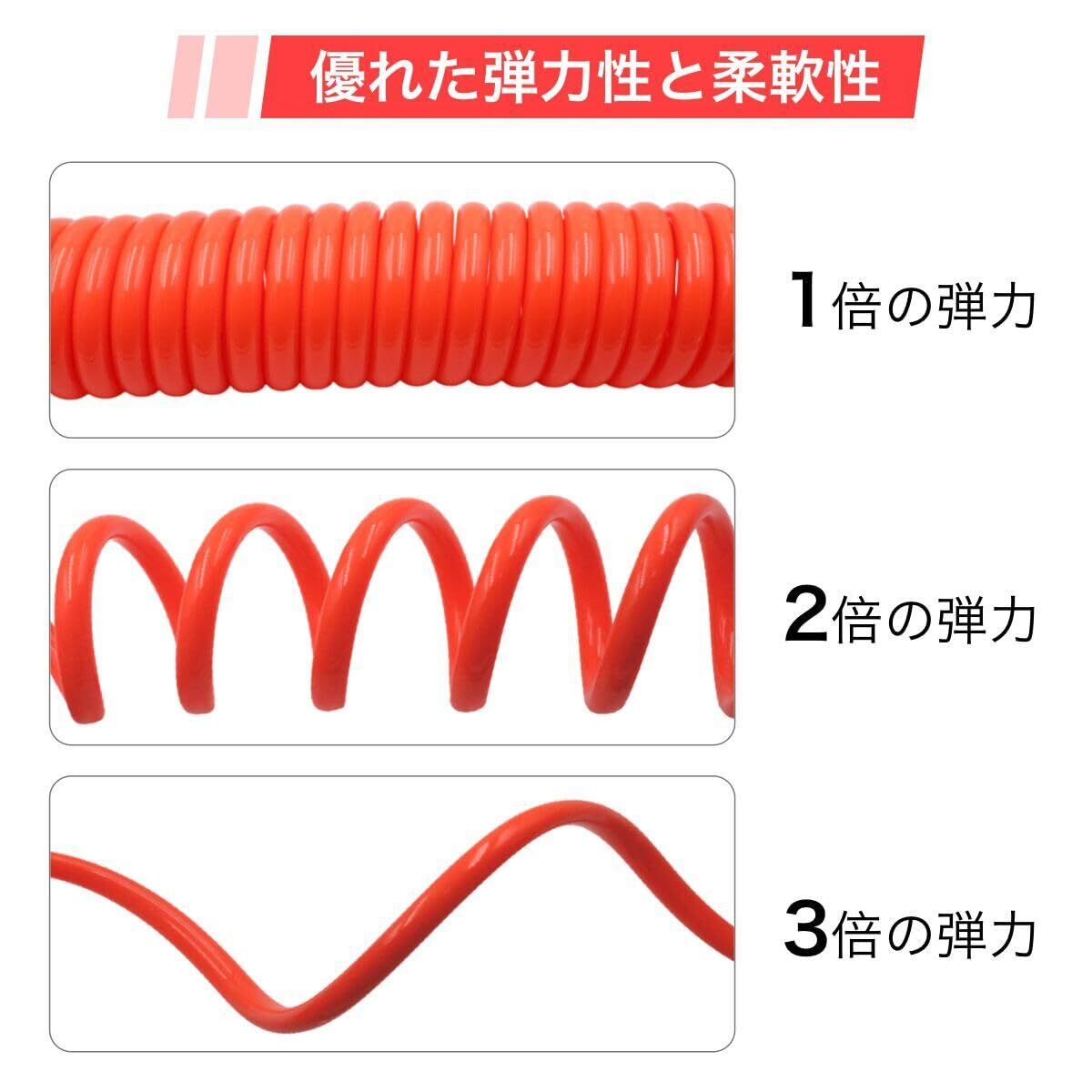 「耐久性に優れたスパイラル設計を採用し、しなやかでありながらしっかりとした強度を持っています。巻き癖がつきにくく、使うたびに快適にご利用いただけます。様々な作業条件にも対応するため、安心してお使いください!」