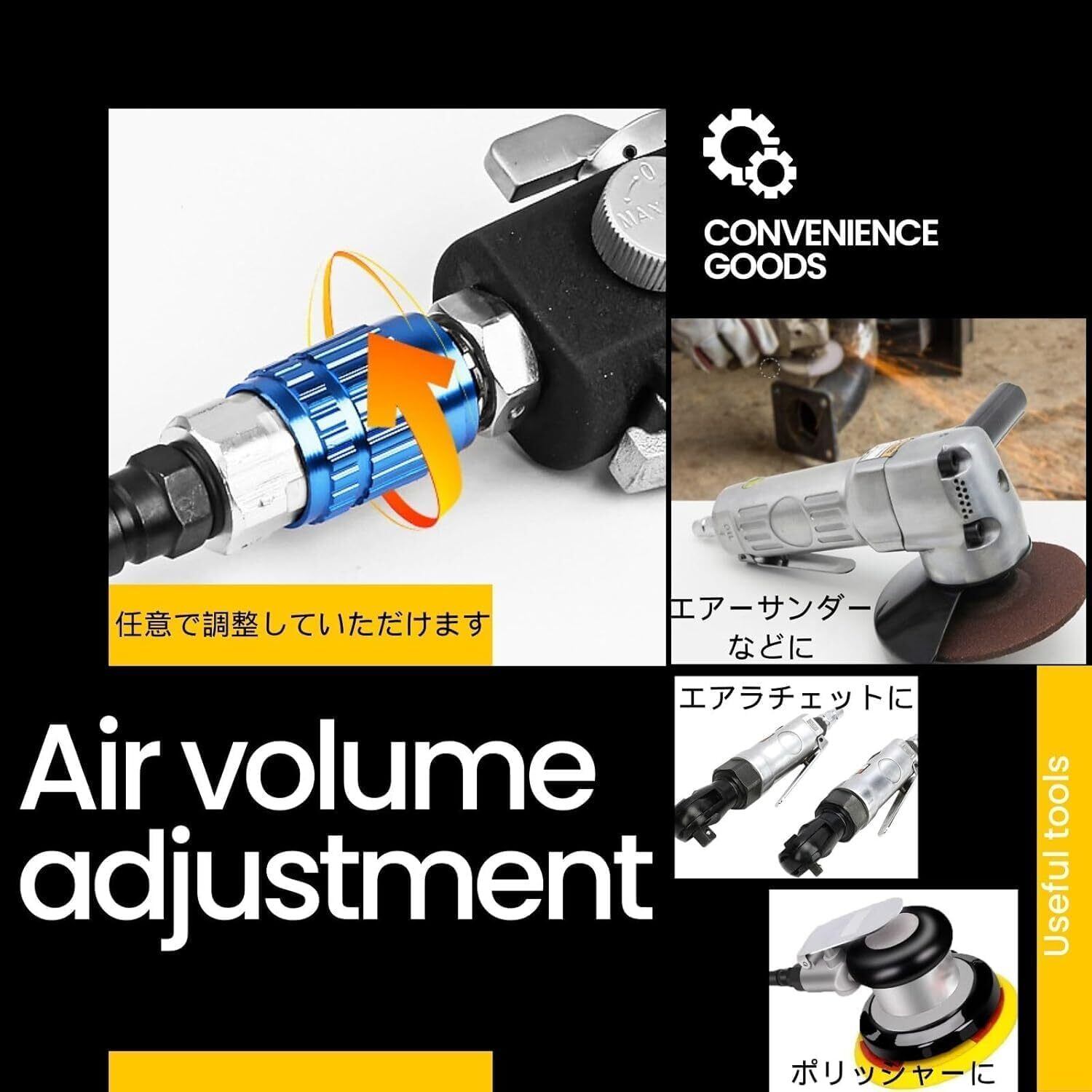 エアホースとエア工具用ダスタと空気流量制御エアーレギュレーターのセットは、調整ダイアルにより空気量を調節していただけます。任意での強さに調整していただけますので、エアリューター エアラチェット エアーサンダー エアーベルトサンダー エアポリッシャー エアーアングルサンダー エアーブラスター エアーグラインダー エアブラシ エアースプレーガンなどの調整が必要な作業の便利アイテムとしてお使いください。