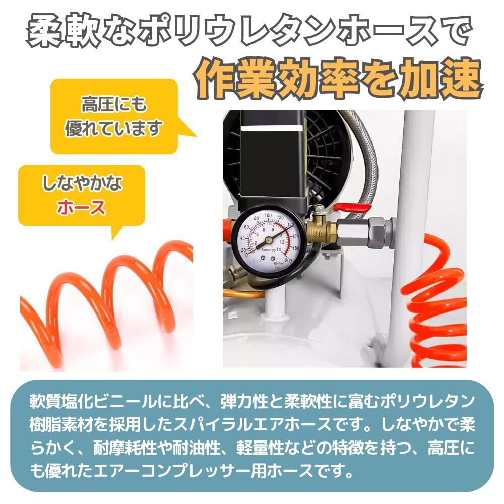 【柔軟なPUスパイラルホースで作業効率を加速】軟質塩化ビニールに比べ、弾力性と柔軟性に富むポリウレタン樹脂素材を採用したスパイラルエアホースです。しなやかで柔らかく、耐摩耗性や耐油性、軽量性などの特徴を持つ、高圧にも優れたエアーコンプレッサー用ホースです。