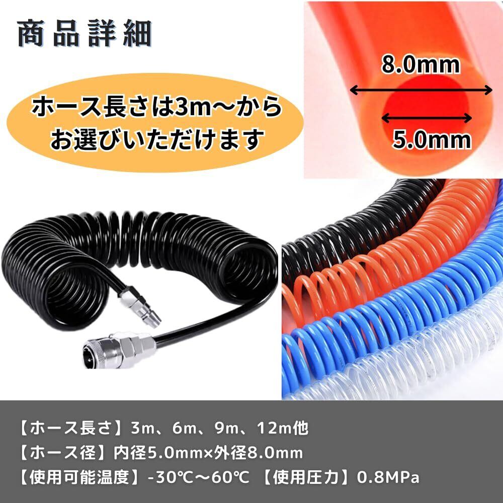 PLEAVIT エアーホース スパイラル 内径5mm 外径8mm 6m ワンタッチ カプラー 継ぎ手 PUウレタン 黒