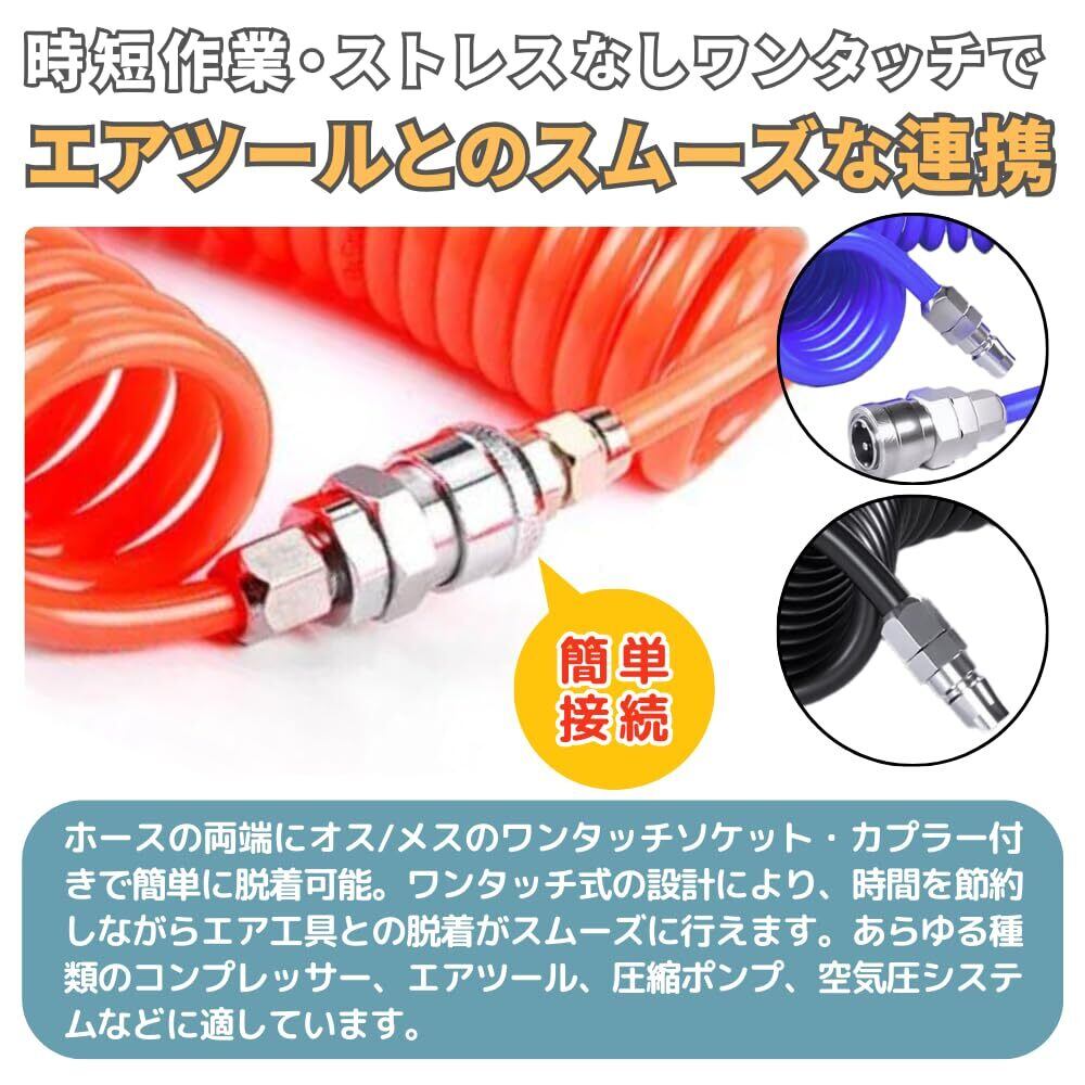 【時短作業、ストレスなし。ワンタッチでエアツールとのスムーズな連携】ホースの両端にオス/メスのワンタッチソケット・カプラー付きで簡単に脱着可能。ワンタッチ式の設計により、時間を節約しながらエア工具との脱着がスムーズに行えます。あらゆる種類のコンプレッサー、エアツール、圧縮ポンプ、空気圧システムなどに適しています。