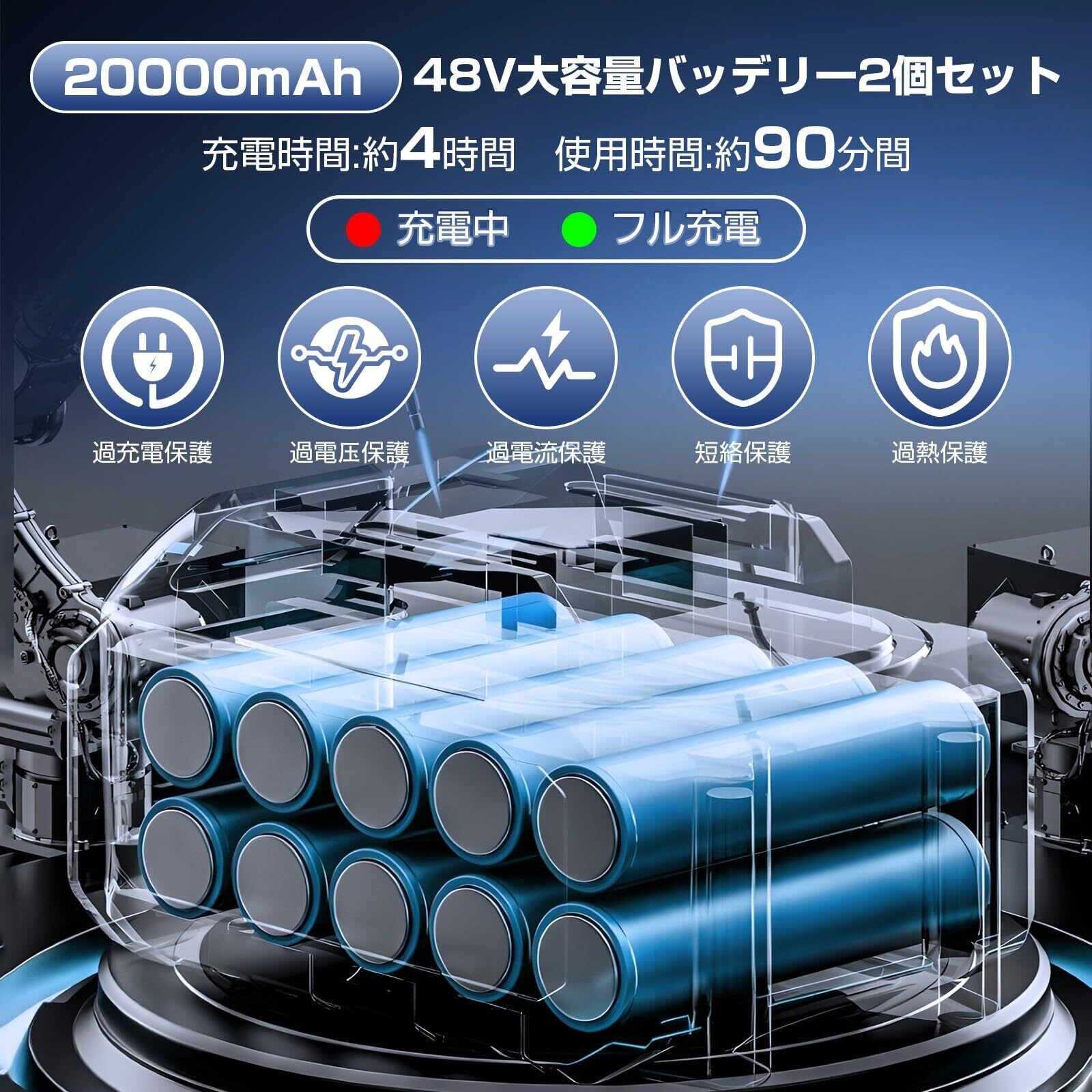 【48V・20000mAh大容量バッテリー搭載&マキタ18V互換】コードレス仕様で電源のない場所でも自由に使える充電式タイプ。新技術採用のリチウム電池で電力効率が向上し、最大90分間連続使用が可能です。洗車、庭掃除、ベランダ清掃など幅広く活躍。マキタ18Vバッテリー(電圧18〜21V・電流11〜12A範囲内)とも互換性あり。※安全のため、初回使用前にはフル充電をおすすめします。