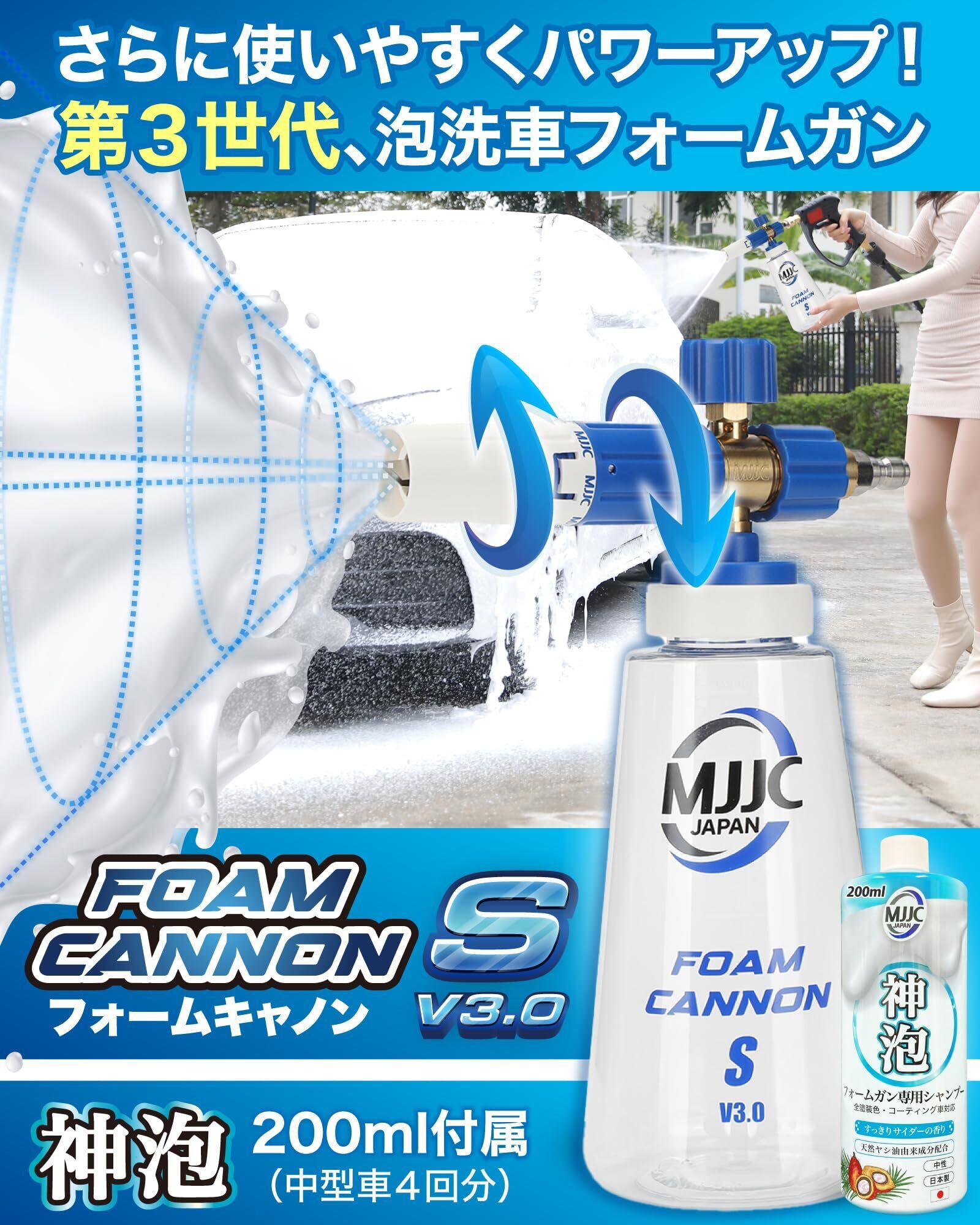 「『MJJC 第3世代 フォームキャノンS V3.0』は、あなたの洗車を劇的に変える洗車セットです。高圧洗浄機と相性抜群のフォームガンが、泡洗浄を手軽に実現。愛車を優しく包み込むようなクリーミーな泡で、汚れをしっかりと落とします!」