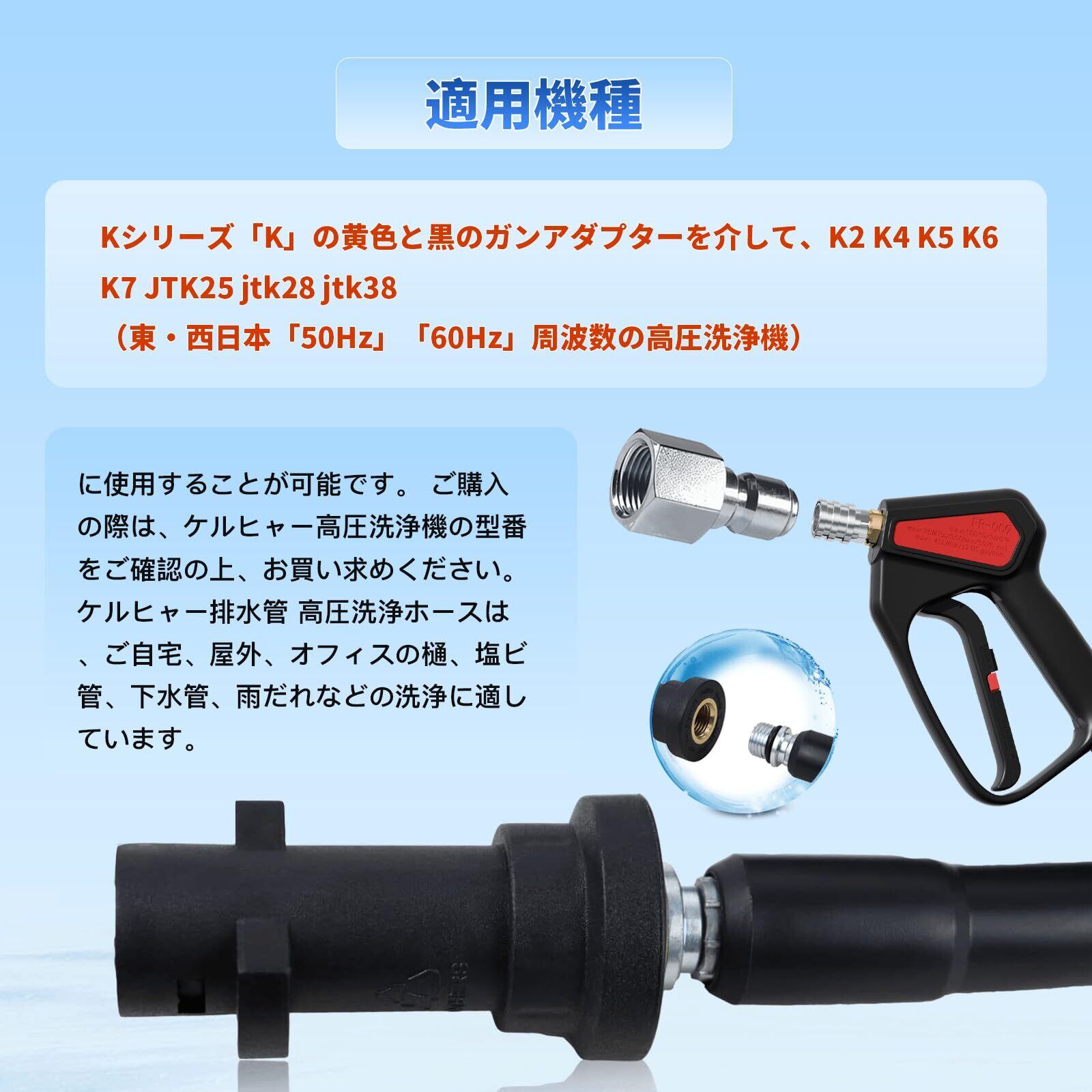 【適用型】AkitsubaケルヒャーパイプクリーニングホースはケルヒャーKシリーズに対応出来ます。karcherのK 2、K 3、K 4、k 5、K 6、K 7、ジャパネットJTKサイレント、JTK25、JTK28、JTK38、kminiなどに対応します。配管高圧洗浄ホースとして自宅 、屋外、オフィスの下水管、排水溝、塩ビパイプ、汚水管、雨どいなどの清掃作業に適しています。利用コツ:詰まりがひどい時、無理に引っ張らず、違う方向から捻りながらゆっくり進めるのはコツです。