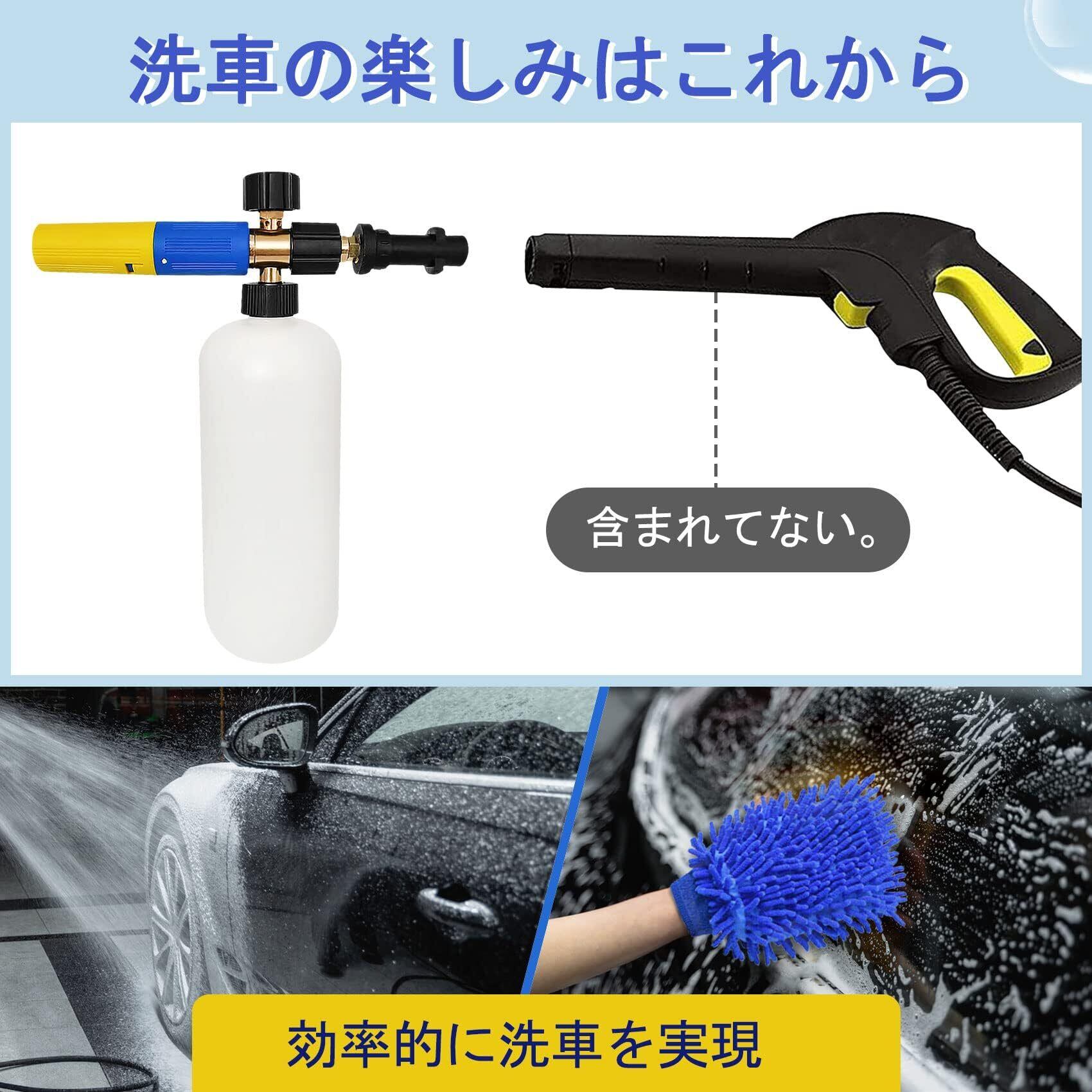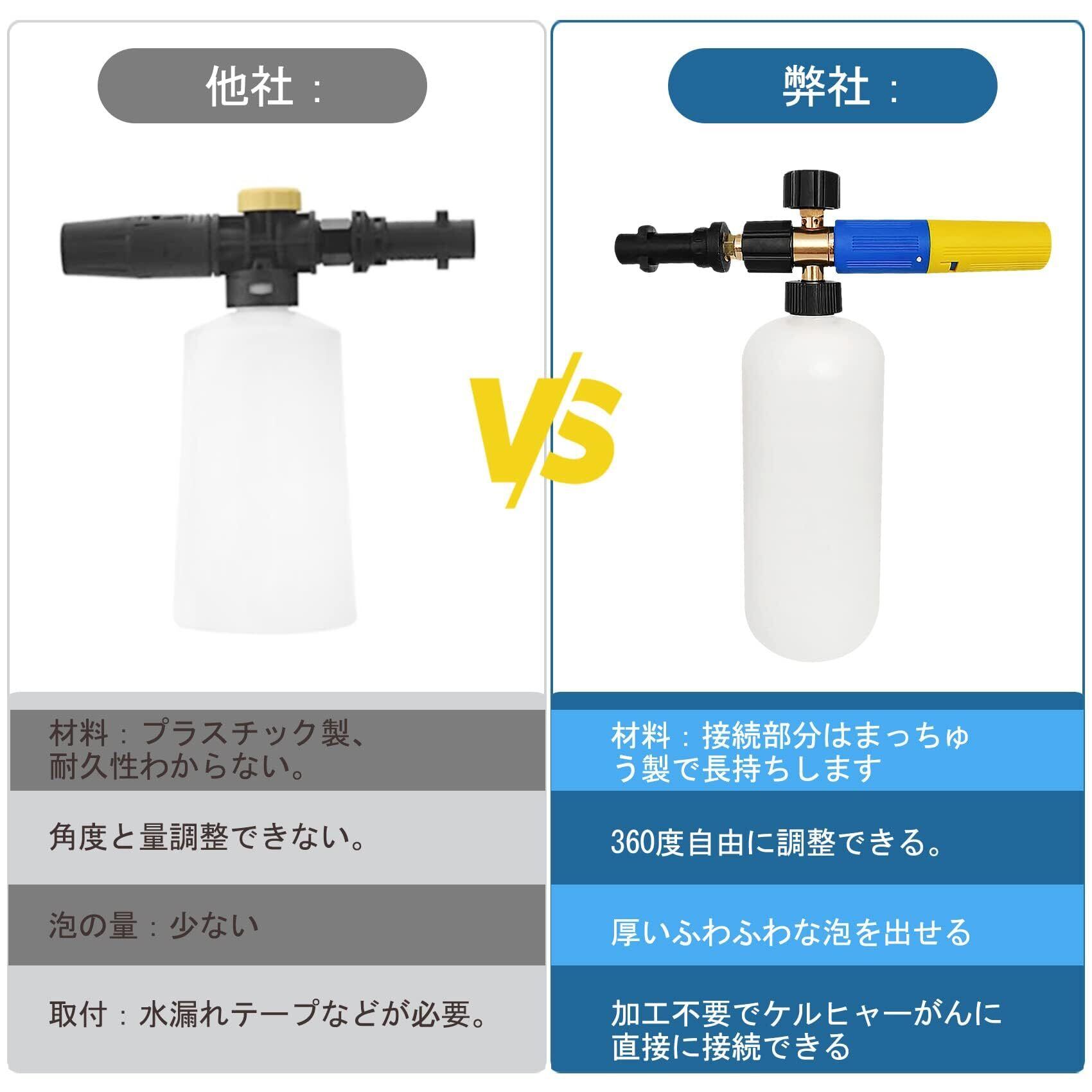【優れたデザインのケルヒャー 泡 フォームガン】本ケルヒャー 泡 フォームガンは改善版でコネクターの取付不要で一発で接続できます。水漏れ防止のテープをくるくる手間がなくて、もっと簡単便利です。 ケルヒャー フォームノズル は角度360度回せるので、発泡の量と角度は調整可能です。 容量1L、半透明なボディ本体は残る量を確認できて大型の車なども一回の操作で洗車します。 ご注意:接続部はoリング設計なので、左右に振ると自動的下向けになります。