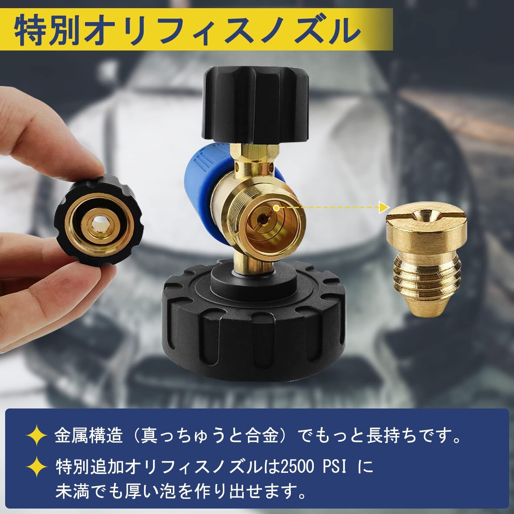【もこもこ洗車!高発泡可能ケルヒャー スノーフォームランス】本ケルヒャーフォームガンは追加オリフィスノズルがあって、2500 PSI に未満でも厚い泡を作り出します。普通の ケルヒャーフォームガンより発泡能力が高めます。また泡立ち状況はシャンプーの成分、性能、水割りにも関係あります。1.1mmノズルをご利用すると、最適な泡の状態に近づけます。ケルヒャー 泡洗車 フォームガンは豊かで繊細な泡でき、車のほか、室外の庭、屋根、室内の窓、床なども清掃できます。(追加オリフィスノズル1.1mmノズルとフォームメーカーは本体に含まれて、取り付け不要です。)