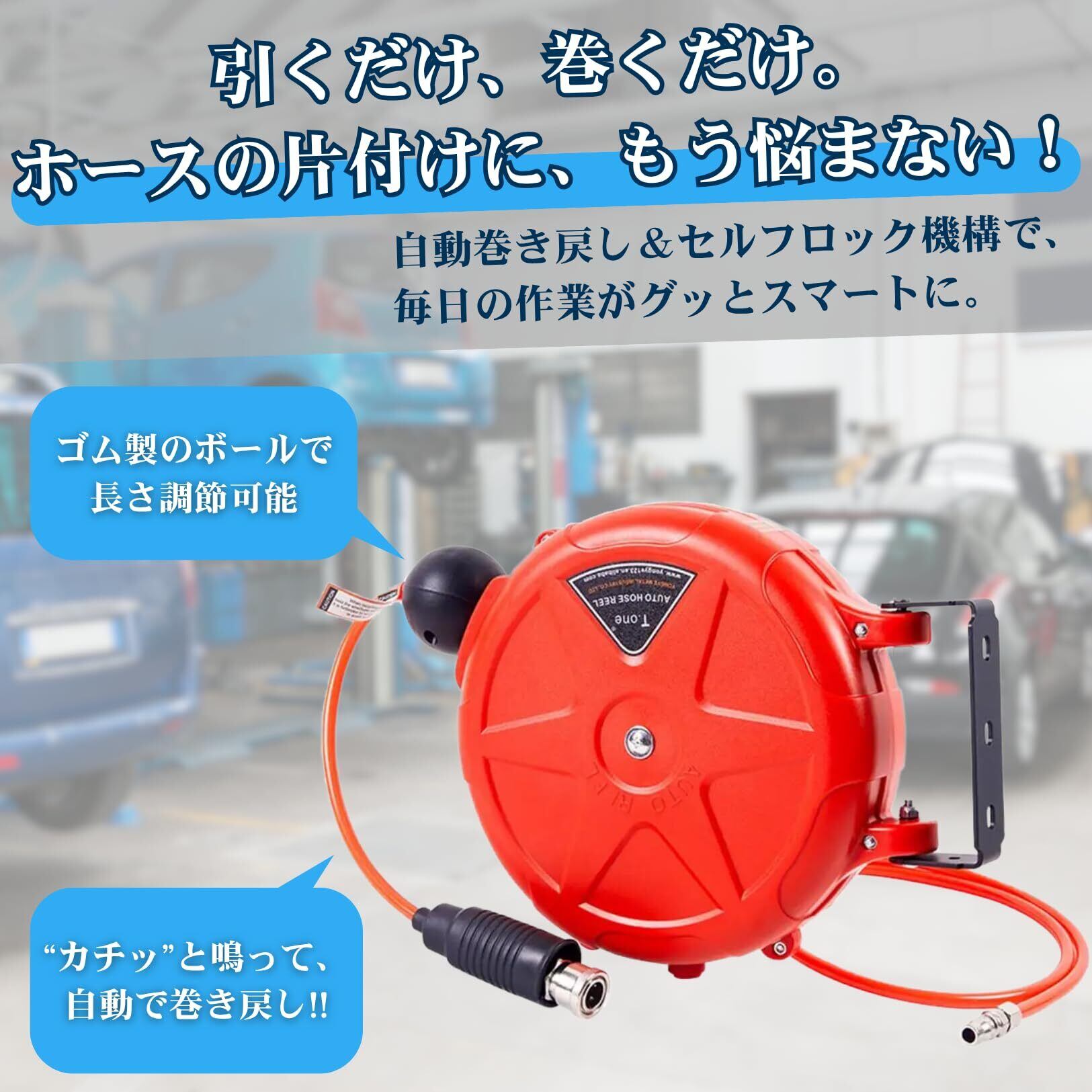 このエアホースリールは、高級PPと金属で作られた頑丈なボディに、自動巻き戻し機能が付いた便利アイテム。