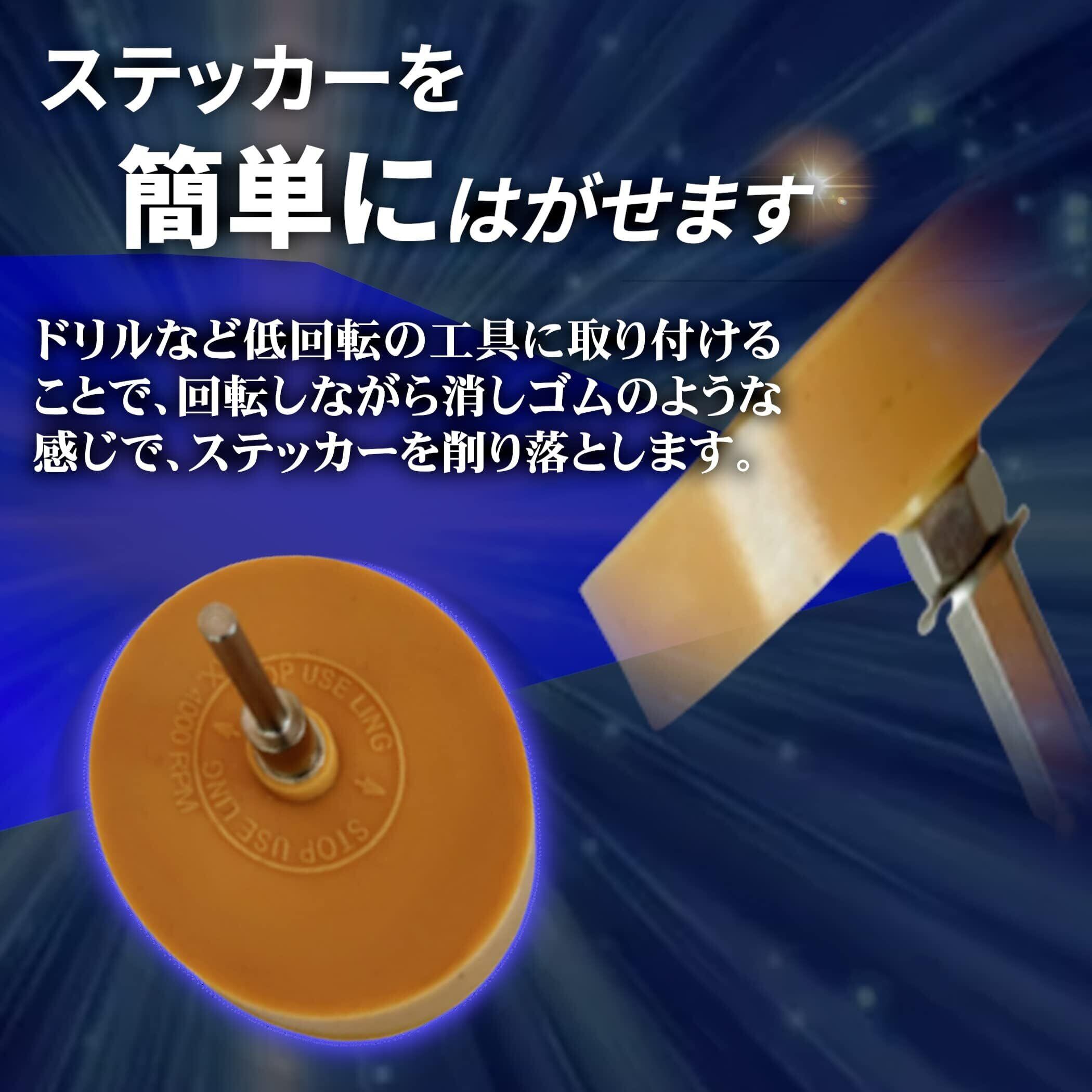ステッカーを簡単にはがせる:・ドリルなど低回転の工具に取り付けることで、回転しながら消しゴムのような感じで、ステッカーやのり残りを削り落とします。 ・ドリルにゴムトレーサーを装着し、はがしたいステッカーに軽くゴムトレーサーを当て、ドリルを回転させ右から左にゆっくりと移動させればステッカー、シールなどを簡単に剥がす事ができます。