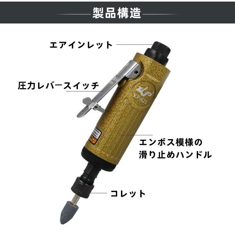 エアーリューター エアーグラインダー 安全スイッチ 高速空気角度ダイグラインダー 空気圧研削盤 3mm 6mmチャック 精密コレット 25000rpm 速度制御 超高速研磨 インレットインタフェース レンチ付き(KP-620(25000rpm)) ストレート グラインダー