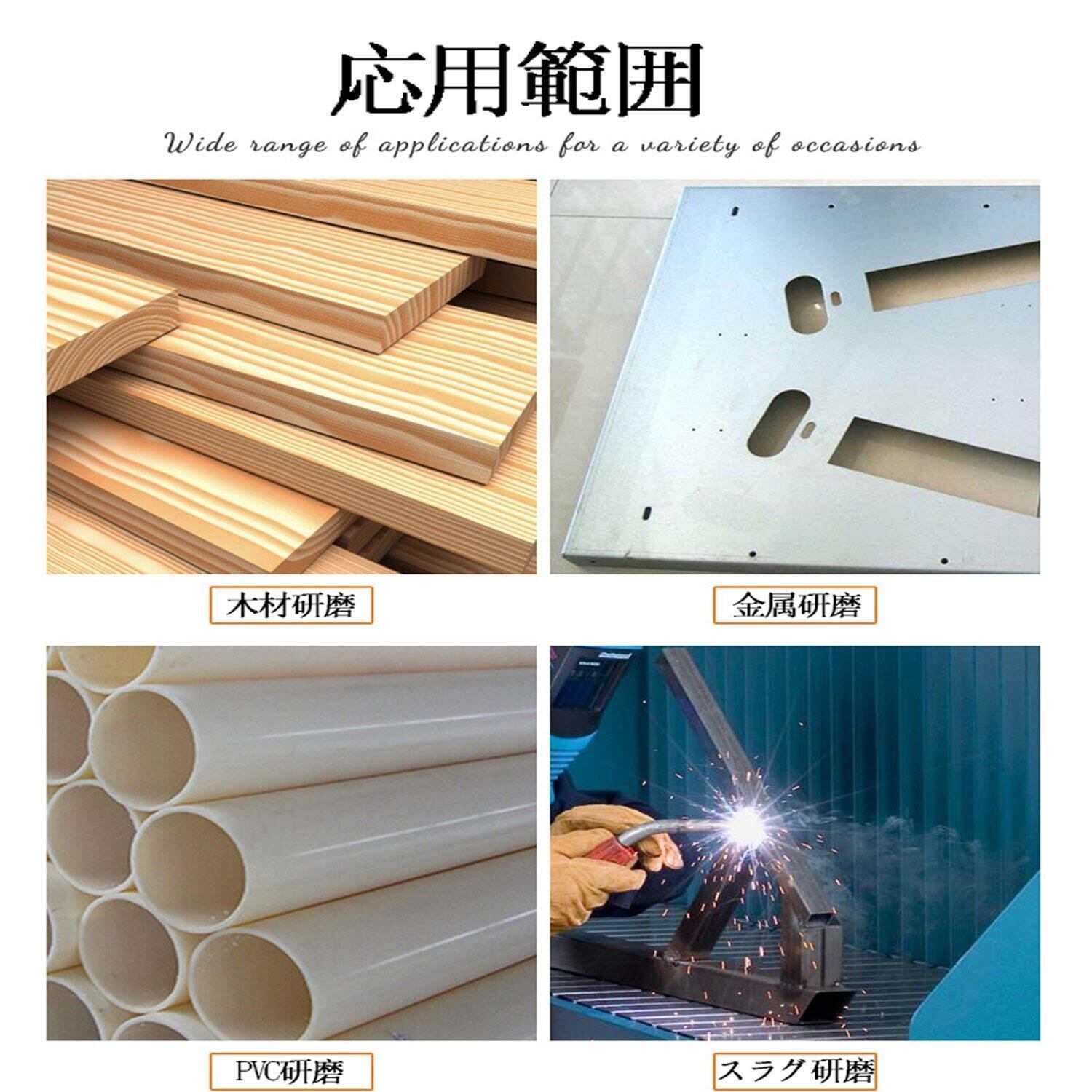 【応用範囲】板金表面の研磨やスポット溶接の研磨、溶接ビート削り、鉄、アルミ、木工、FRP、ダイカスト、鋳物製品面取り、せまい所の研磨、曲面仕上げ等あらゆる材質の研磨作業に便利です。