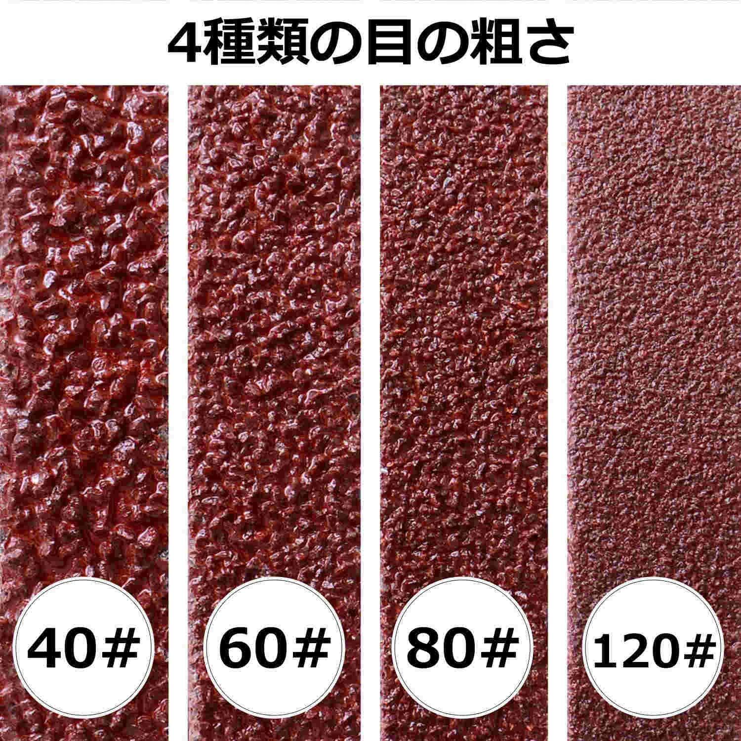 「この商品には、替えベルトが4種類(40、60、80、120)が合計で12本付属しています。異なる粗さのベルトを使用することで、様々な仕上げ作業に柔軟に対応でき、効率よく作業を進められます。」