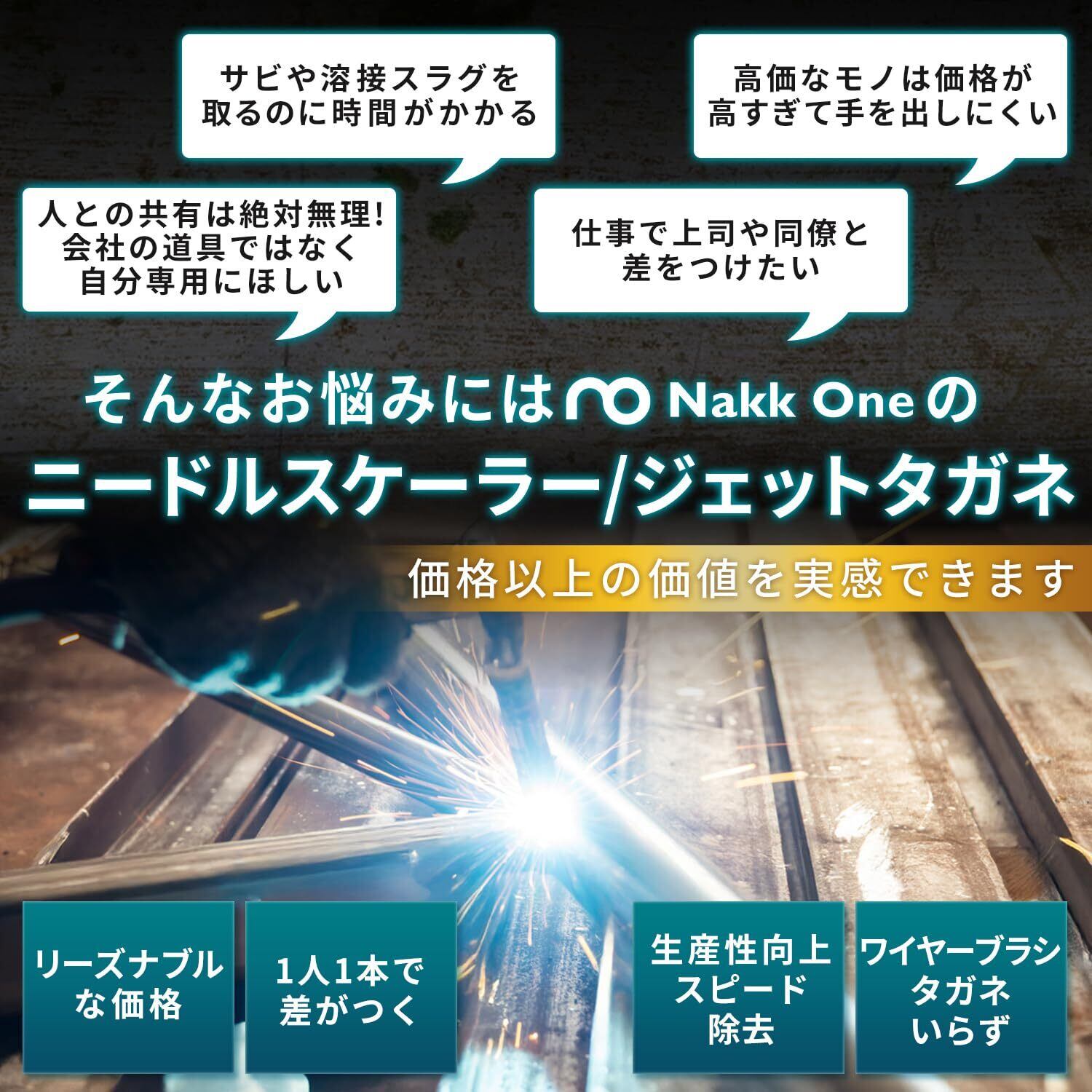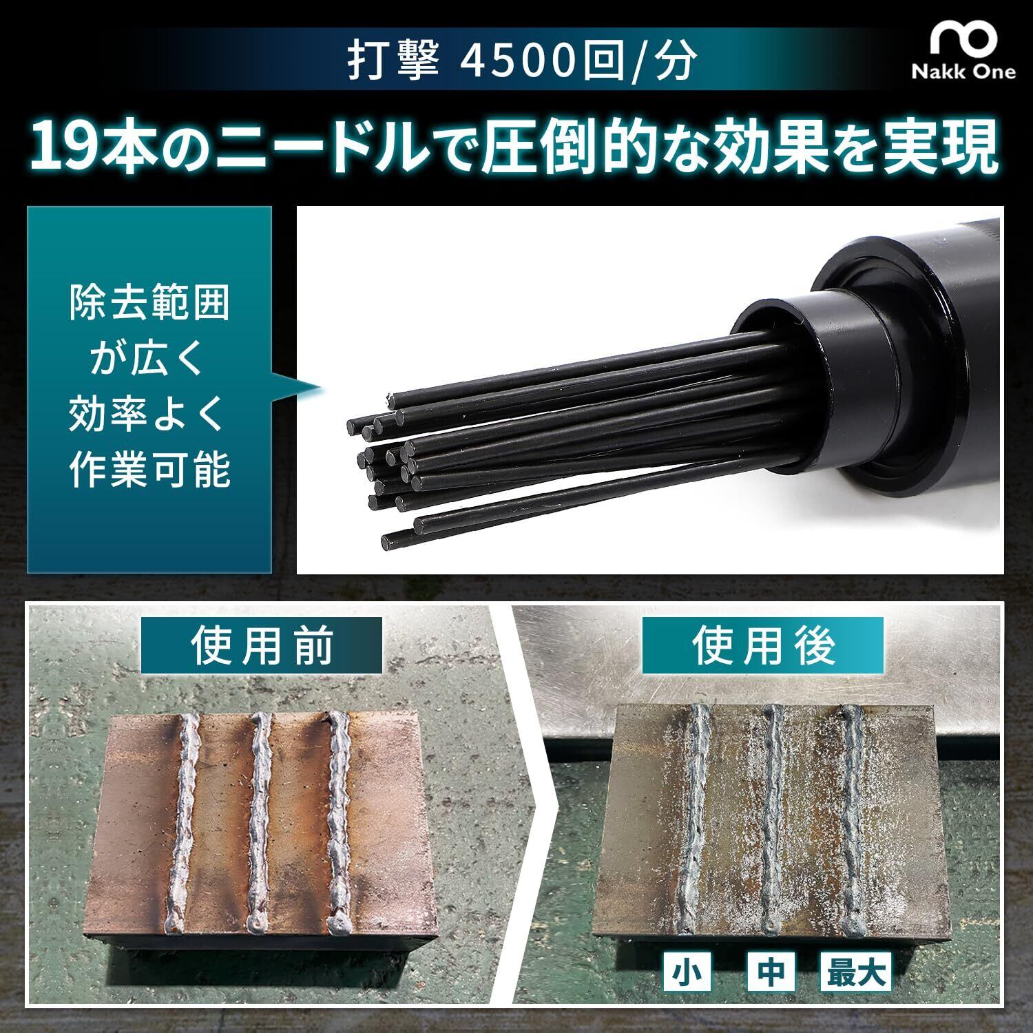 【4500回/分のハイパワー】 Nakk One ニードルスケーラーは、毎分4500回の強力な打撃でスラグや錆を素早く除去!金属表面の仕上げや塗装前処理に最適で、作業時間を短縮し、生産性を向上させます。 【プロ仕様 – 現場で実証済み】 現役の溶接工が監修したプロ向けエアツール。高耐久ボディ&強力エアパワーで、鉄工・造船・建設業などの過酷な環境でも長期間使用可能! 【軽量&快適 – 疲れにくい人間工学デザイン】 長時間の作業でも負担が少ない軽量設計。操作しやすく、作業効率を大幅にアップ! 【多用途対応 – 19本のスチールニードル】 付属の19本の耐久性ニードルが金属・コンクリート・木材などに対応。 サビ取り スラグ除去 塗装剥がし 溶接後の仕上げ に最適! 【簡単操作 – 初心者でも安心】 直感的なトリガー操作で、初めてでも簡単に使いこなせる設計。 【幅広いシーンで活躍】 溶接後のスラグ除去(鉄工・造船・建設業に最適) 金属・コンクリートのサビ取り・塗装剥がし 自動車・バイク・重機のメンテナンス 鉄骨・工場設備の補修作業 Nakk One ニードルスケーラーで、圧倒的なパワーと作業効率を体感してください!